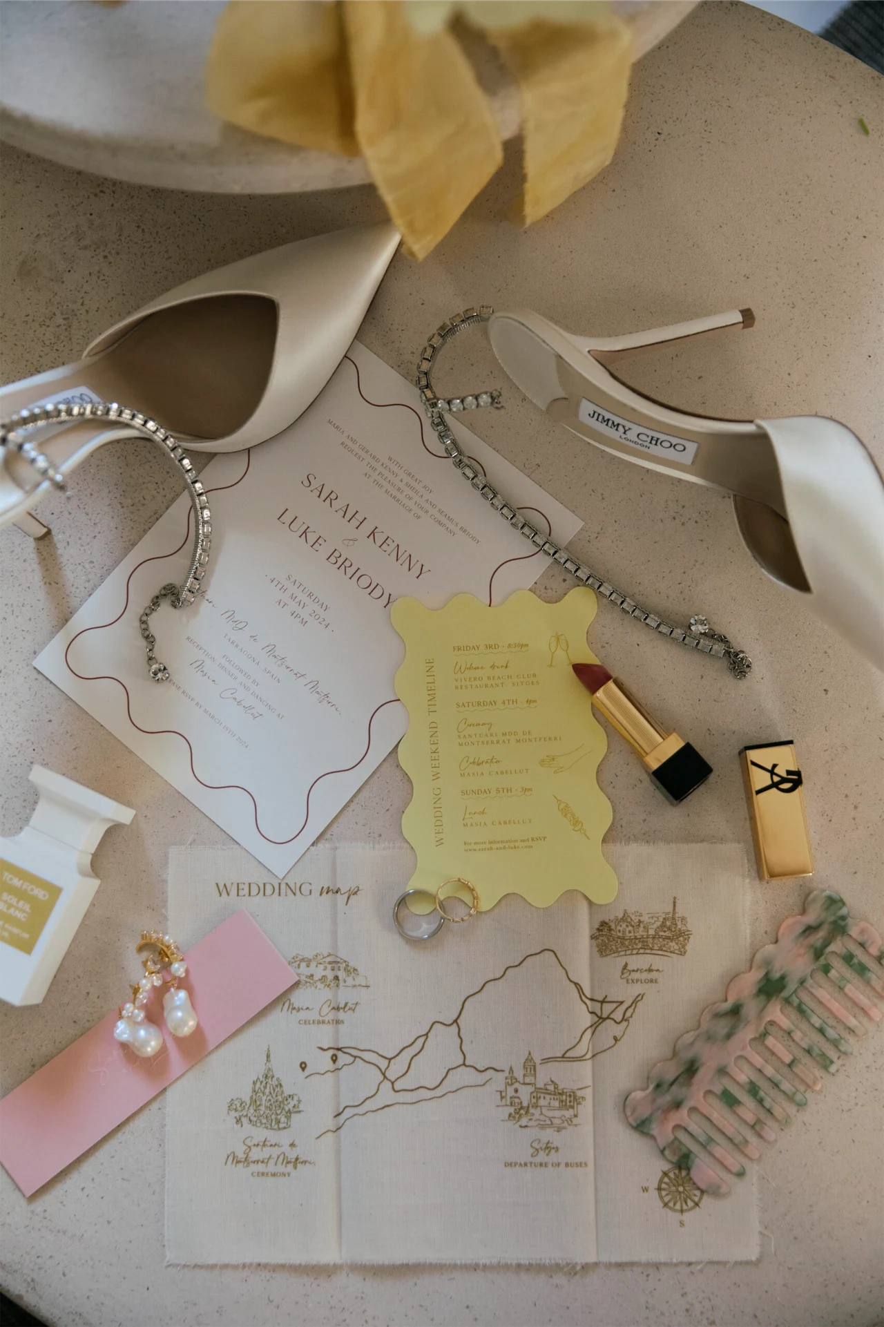 The graphic designer Sarah and Betsaida worked with, Xiana, who was excellent. The wedding invites had three elements, an invitation, a timeline of events, and a little “keepsake” – a cloth-printed map of the key places from the wedding weekend. We incorporated a “wavy” design and pops of pink and lemon yellow across all of the decor elements to tie everything together. There was a lot of effort put into the details, and for me, it was so worth it. @reveries.atelier produced Xiana’s stunning designs.