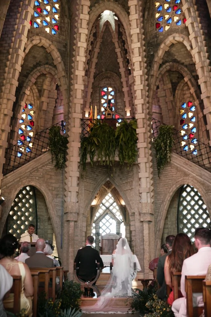 You need to see a photo of the church, or better yet see it in person, to understand how spectacular it really is. Santuari de la Mare de Déu de Montserrat has architecture reminiscent of the Sagrada Familia and was apparently designed by Gaudi’s protege, Josep Maria Jujol. When we first saw it, it reminded us of a wedding cake! The ceremony was a traditional Catholic wedding mass and our programs doubled as fans to help keep guests cool. The planning of a Catholic ceremony abroad is tricky and we had to start the process nine months in advance.
