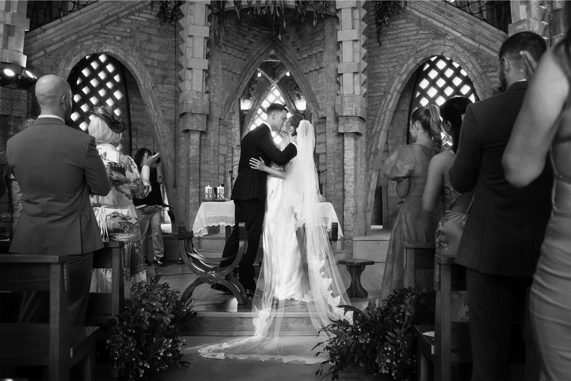 Dress: Vivienne Westwood from Belle Atelier. Bride’s Shoes: Jimmy Choo. Bride’s Earrings: Completed Works. Groom’s Suit: Suitsupply. Planning & Design: The Experialist. Videography: Alicia Mess. Flowers: Studio Floral. Graphic Design: Better With Co. Signs: Reveries Atelier. Make-up & Hair: Imanol Fuentes. Hair: Roy Leigh. Caterer: Sensacions Barcelona. Sound & Lighting: Josep Maria Lopez. Band: Truly Medley Deeply. Rentals: Tot Hosteleria.