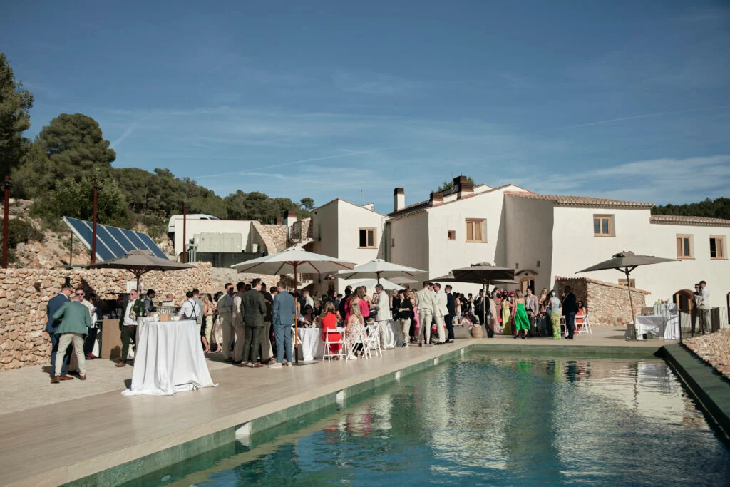 We would describe our reception as a “gastronomical” experience. After the wedding, we invited guests for a poolside “aperitivo” for approximately two hours. Our signature cocktail was a Hugo (my favourite drink) and plenty of Masia Cabellut Cava was flowing. We had 13 passed appetisers that included, wild sea bass tartare, smoked rum pineapple, stuffed cannelloni, patatas bravas, chicken croquettes and on-the-spot smoked salmon. We had a chef slicing Iberico ham and a paella station, serving an outstanding Norwegian lobster and mushroom paella.