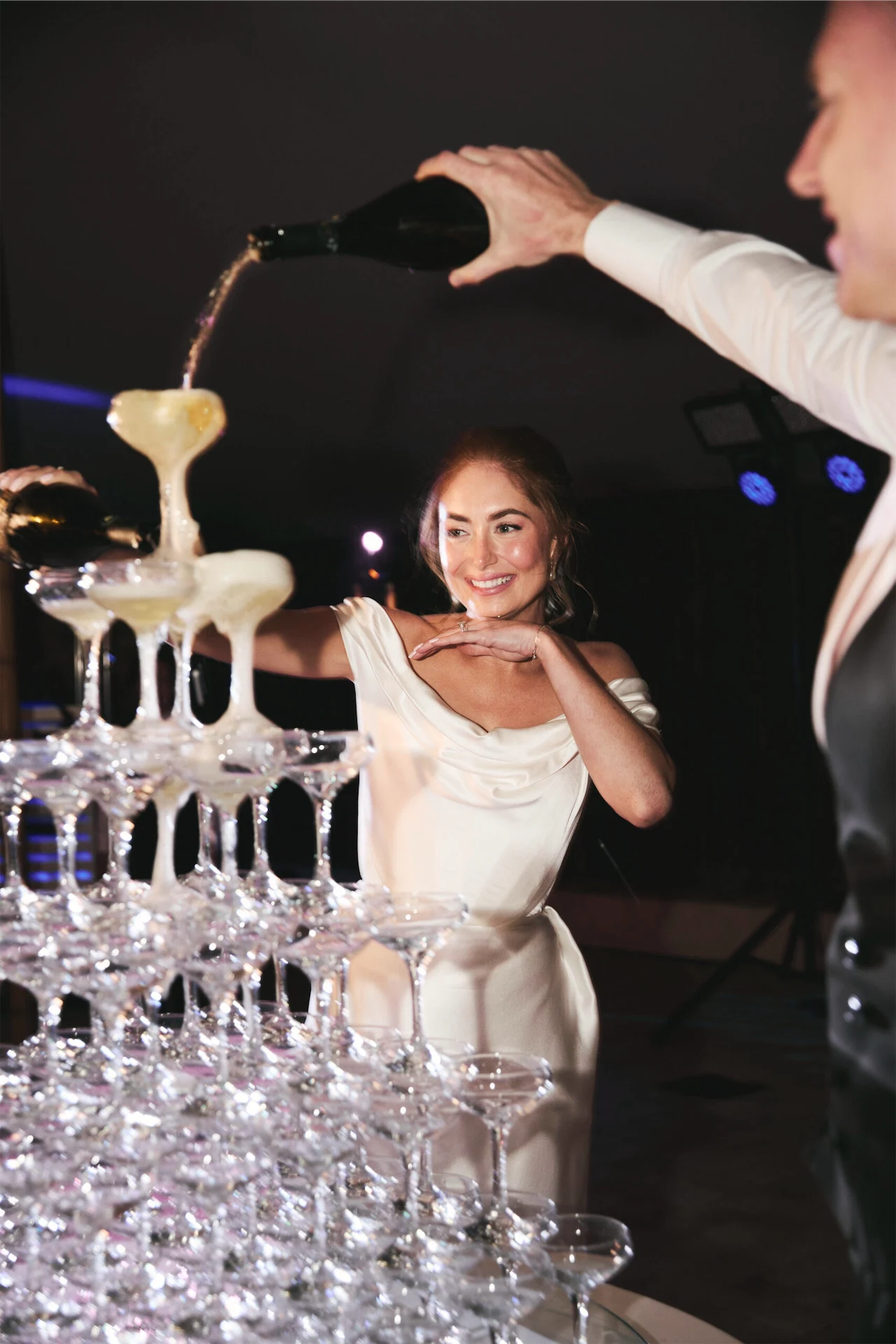 The dinner menu started with marinated salmon and king prawns and was followed up with tender beef or wild sea bass in a coconut sauce. The dessert was a showstopper with each guest getting an alternate of the Sacher Bean (chocolate cake with raspberry mousse disguised as a cocoa bean) or Happy Egg (passionfruit and white chocolate custard on a filo “nest” that looked like a giant egg with a yellow centre and everything!). They decided against a wedding cake and opted for a cava tower instead.