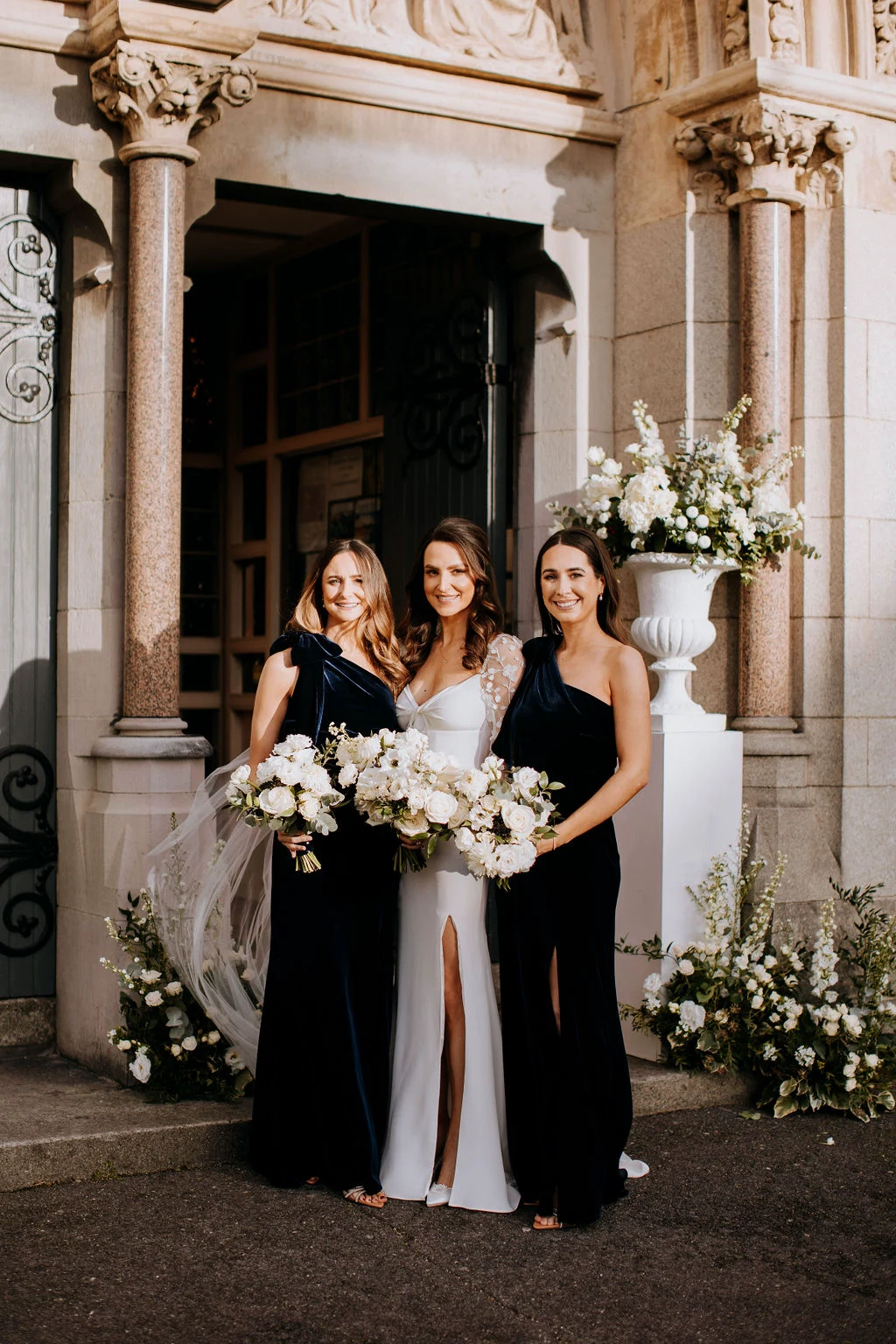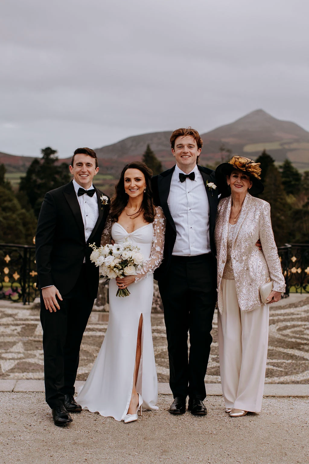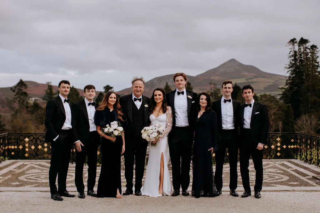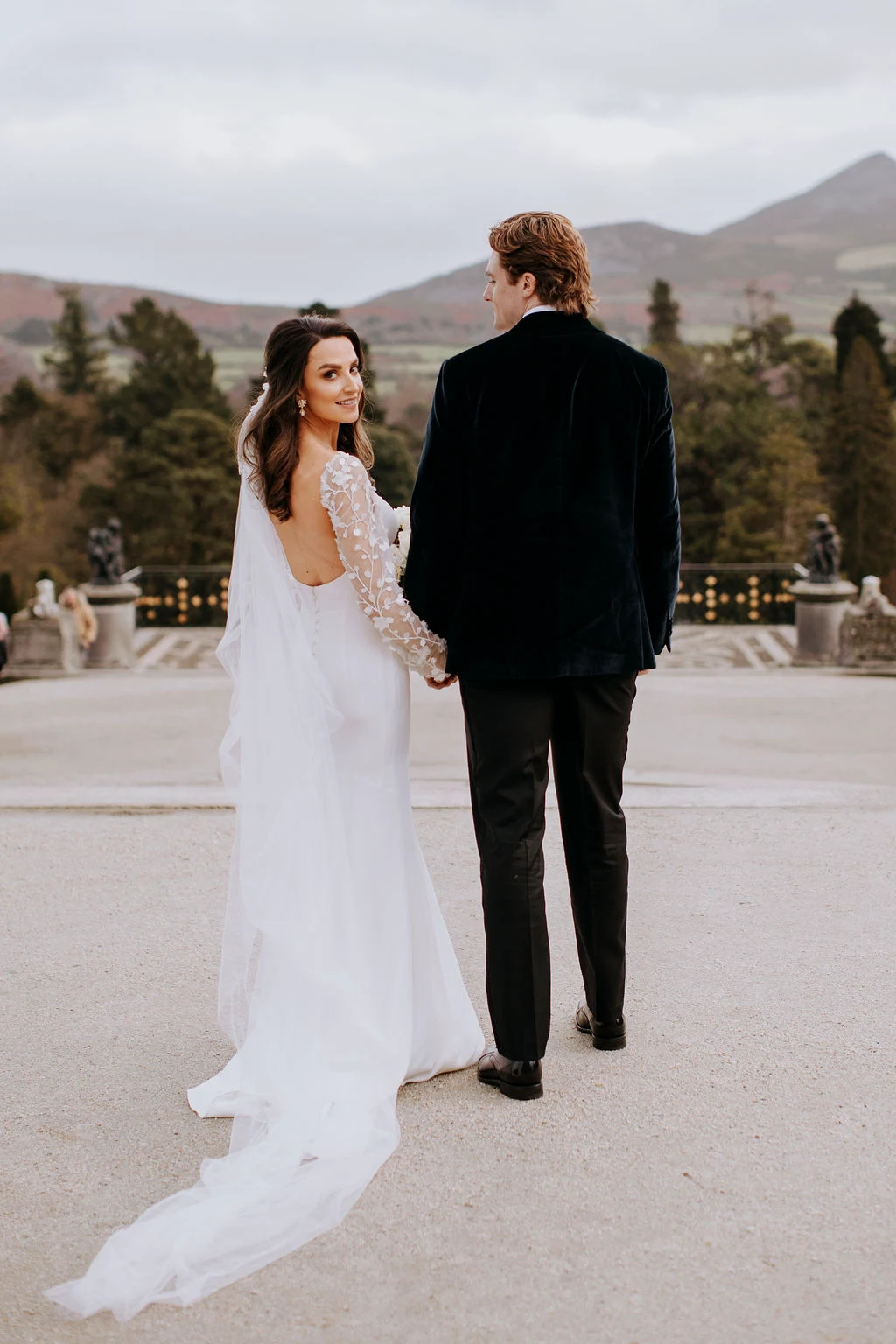Bridesmaid dresses: Folkster. Make-up: Lisa Shannon. Hair: Lou Merryweather. Cake: Marian Johnson, I bake cakes. Flowers: Fernwood Floral Studio. Food: Powerscourt Hotel. Wedding dresses: The Suite & Helen Cody. Tuxedo: Louis Copeland. Music: Katherine Gavin. Wedding band: Spring Break. Videographer: Paul from Old Pine Films. Wedding planner: Aoife Hodgins, Blue Blossom Creative.