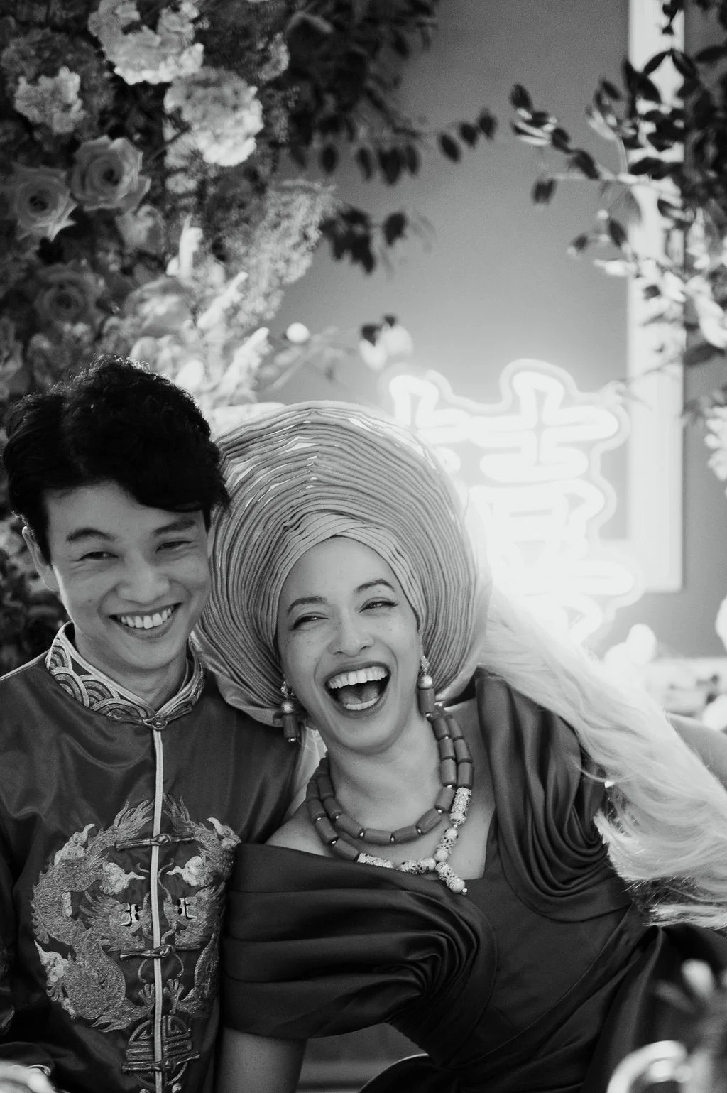 We had a combination of silk lanterns, Nigerian wood carvings, brass candlesticks and incredible florals, including a whole tree constructed by our amazing florist to hang lanterns and tassel charms off of. We ordered an LED Double Happiness light to hang behind our sweetheart’s table during dinner that we’re now trying to figure out how to display somewhere in our home since we love it so much! The rest of our stationery was ordered from Papier.