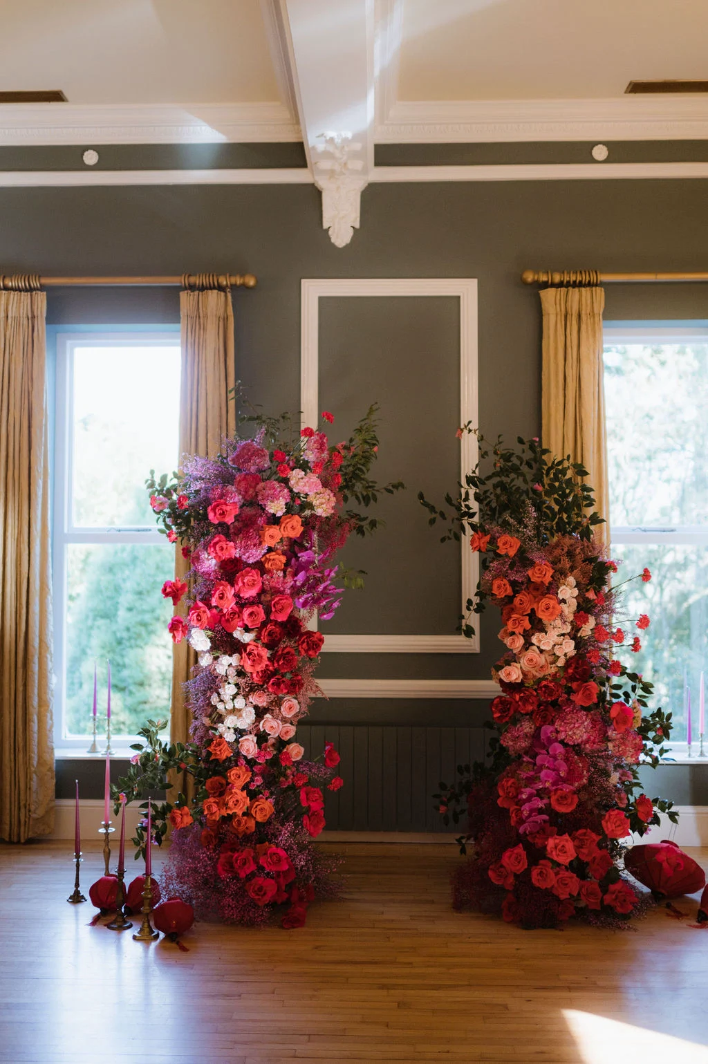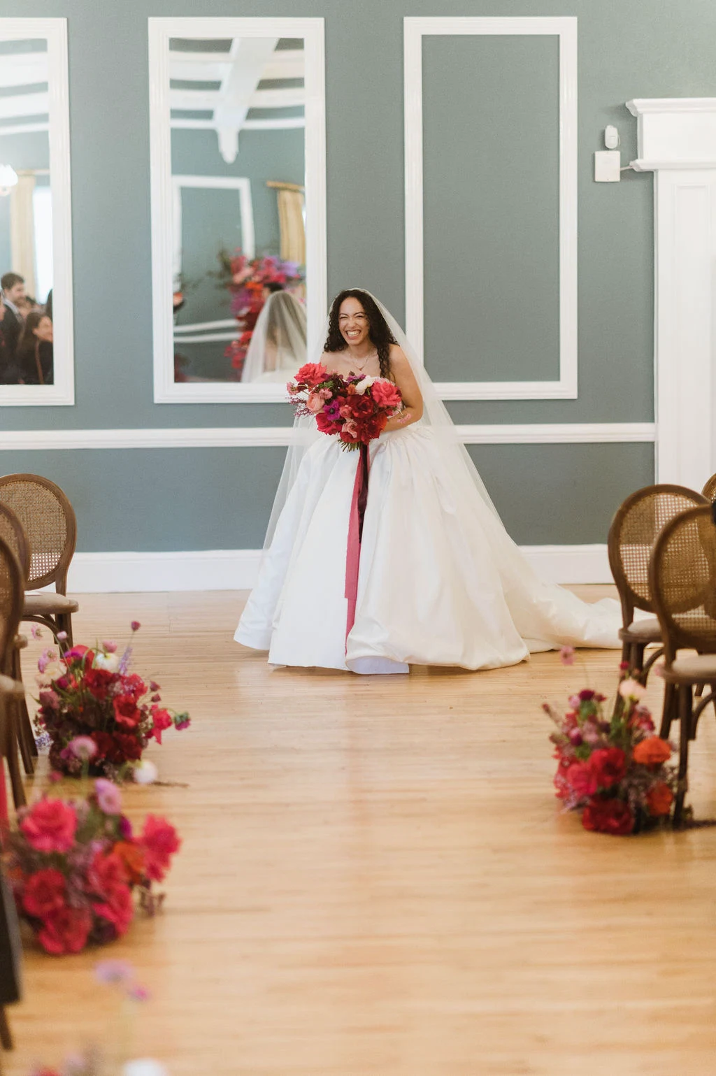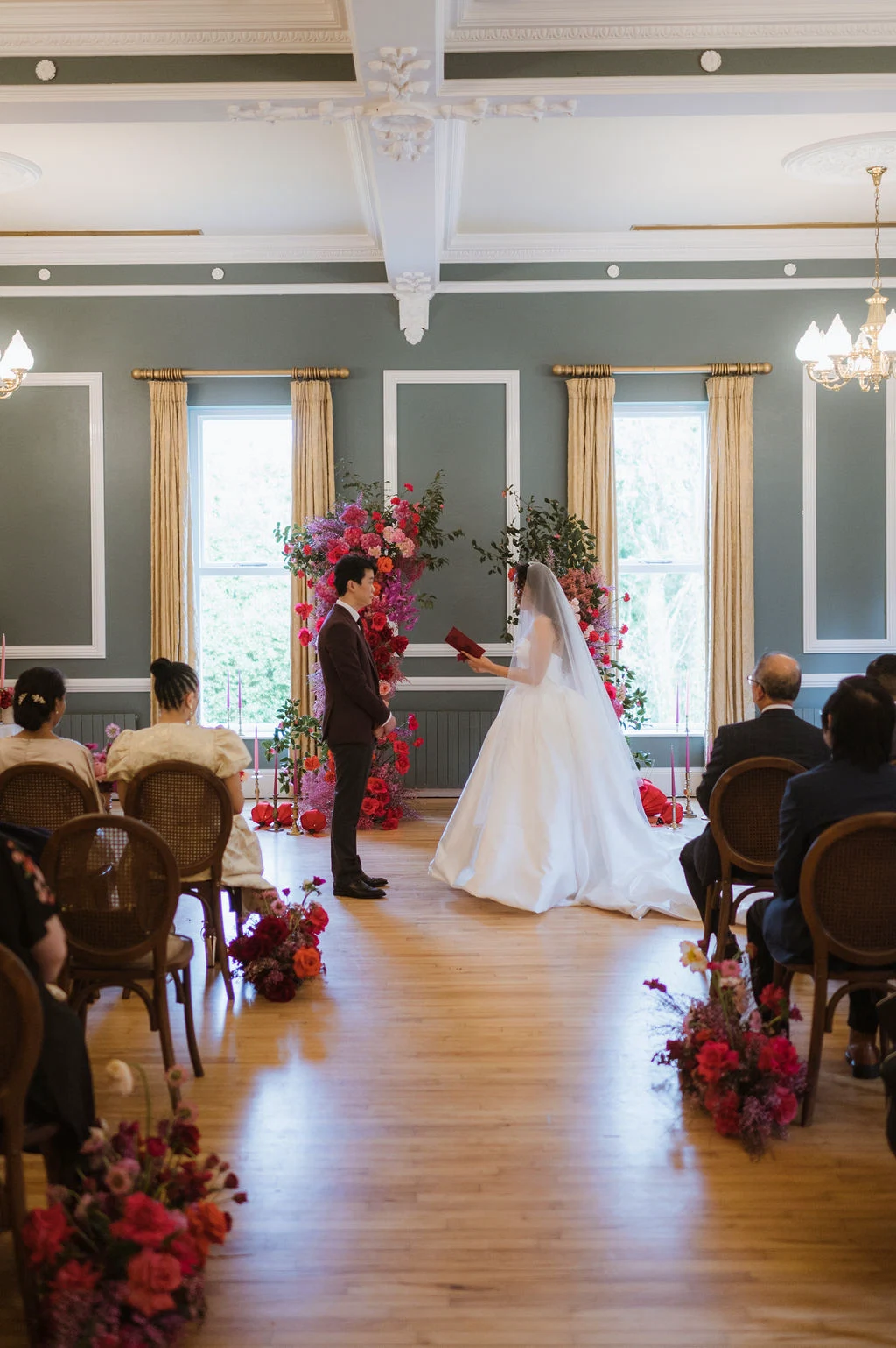 Our ceremony took place in the ballroom at Magheramorne Estate. Although we originally hoped to have the ceremony outside in the garden, due to rain the day before we weren’t able to, but it was the best thing that could have happened. For one, everyone was warmer! But the red and pink florals by The Rosehip and Berry looked incredible against their signature teal blue walls.