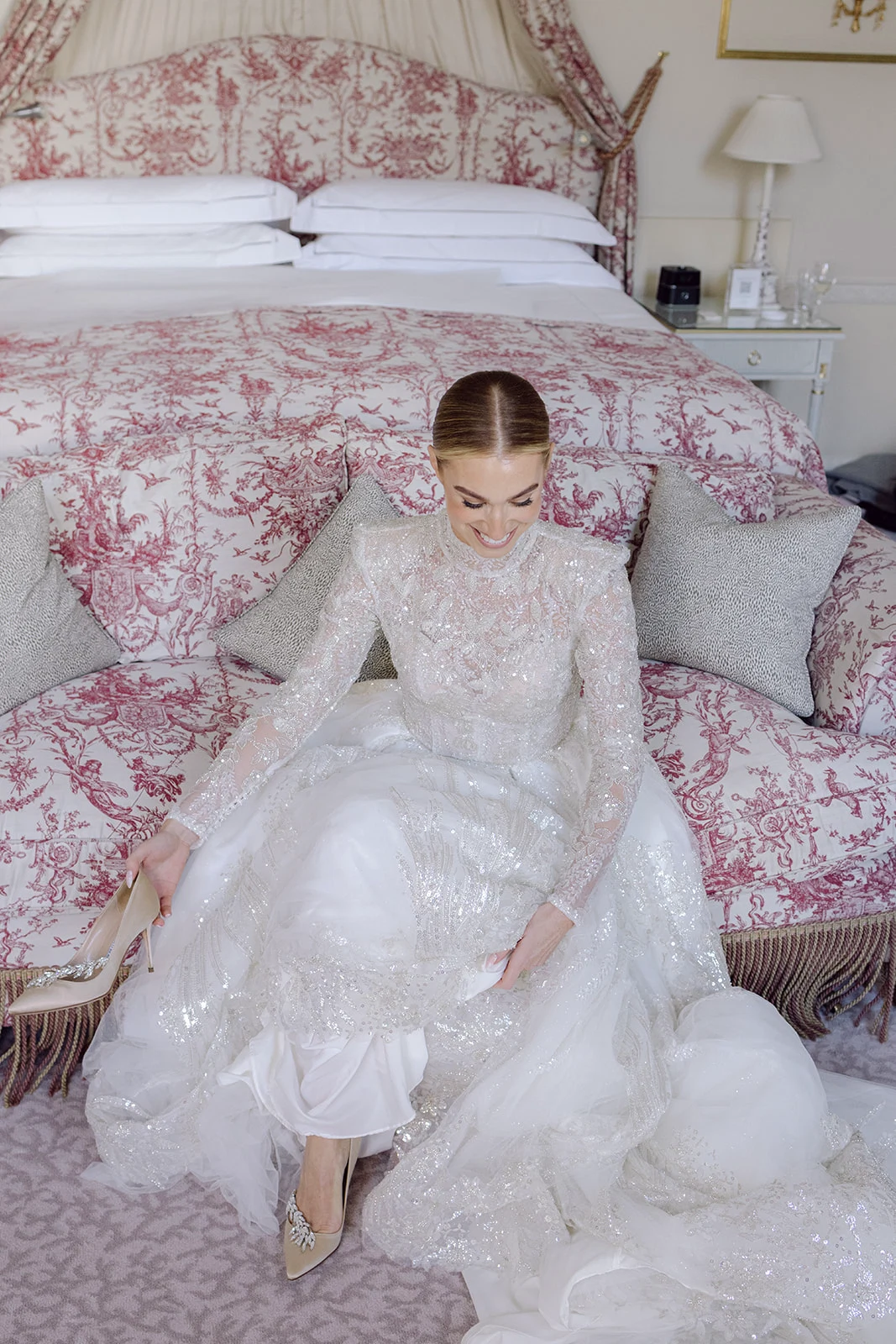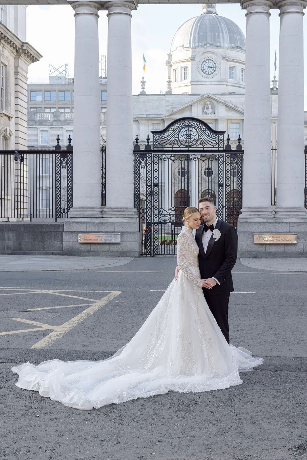 Bride’s Dress: Milla Nova from Verona Bridal. Bride’s Shoes: Manolo Blahnik. Groom’s Suit: Louis Copeland. Flowers: The Garden. Make-up: Natasha Ray. Hair: Danielle Whelan. Venue & Food: The Merrion. Cake: Sweetie Pie.