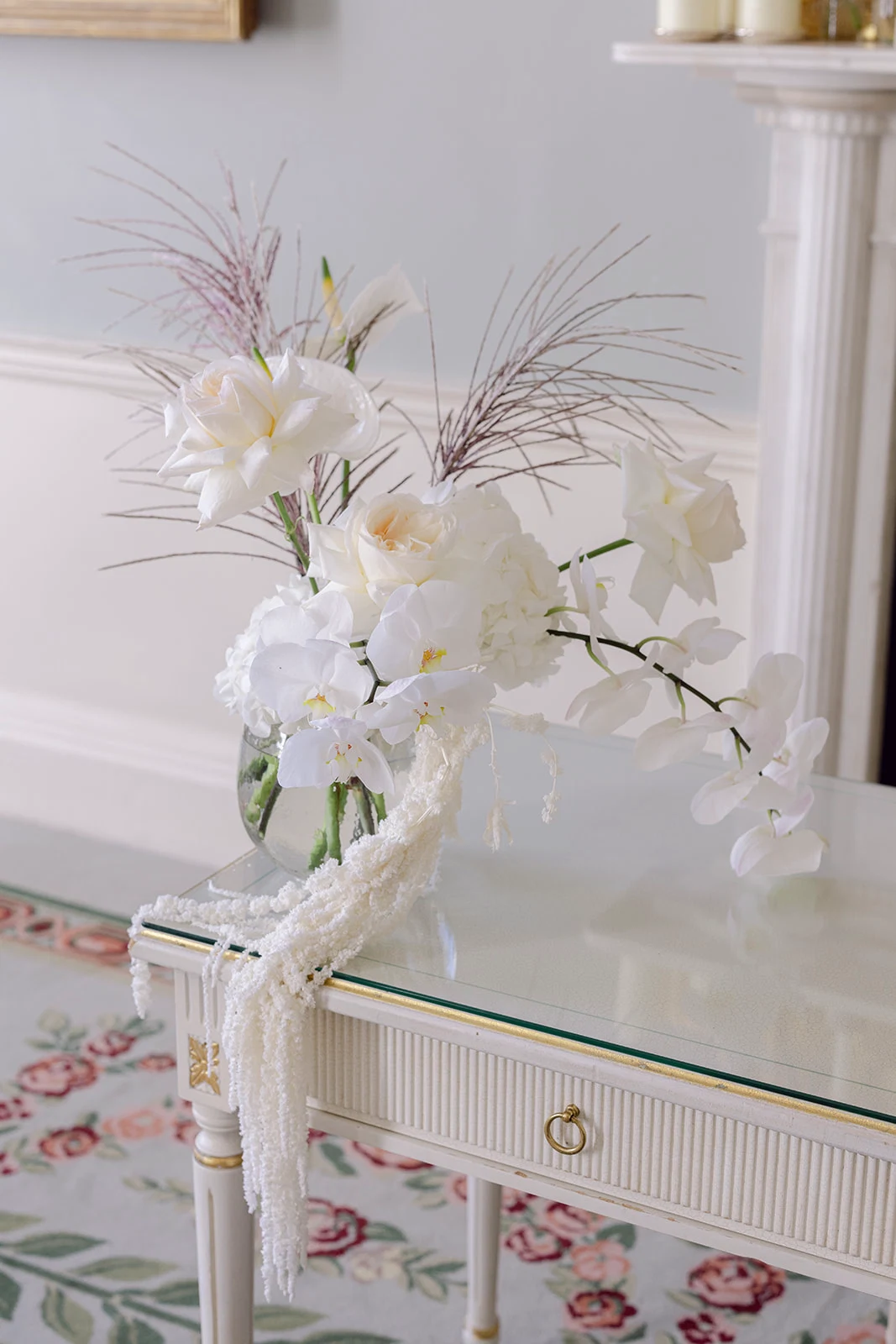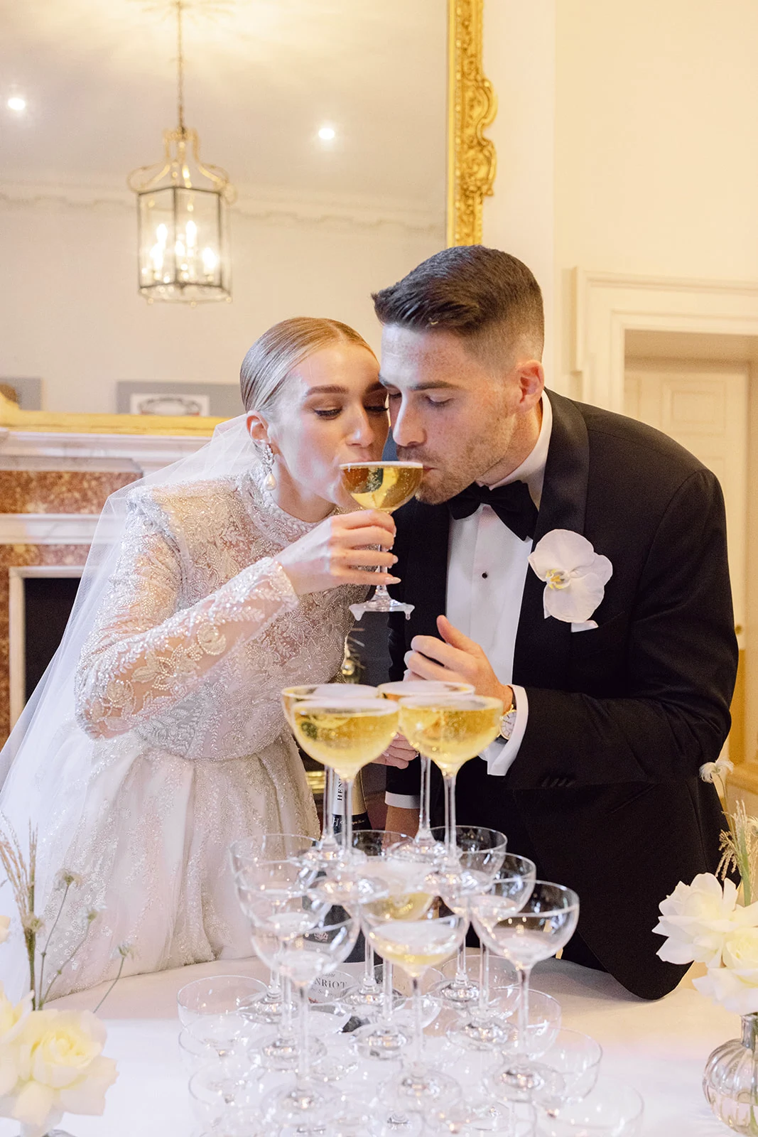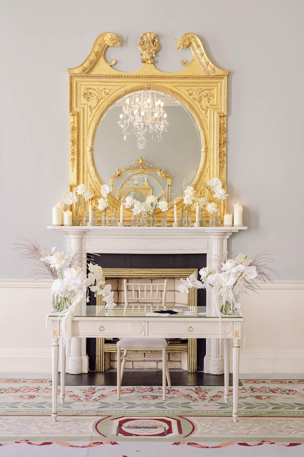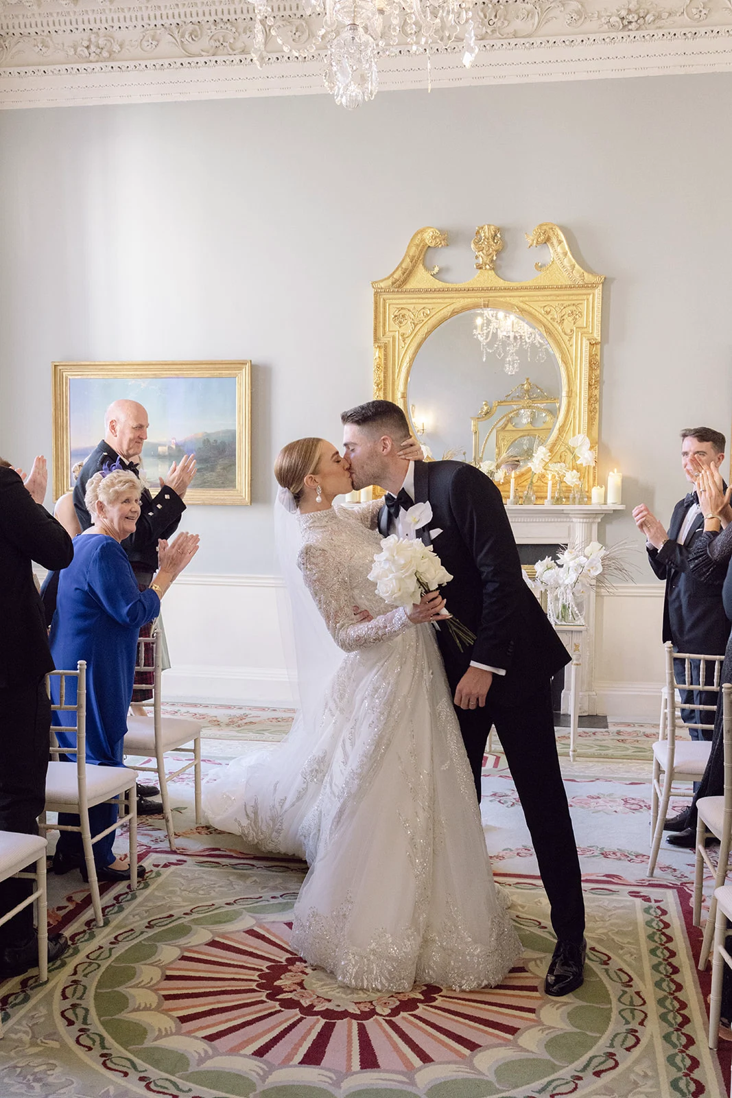 As The Merrion is part of such a gorgeous, restored Georgian townhouse with high ceilings, chandeliers, and ornate cornicing, we didn’t want to take too much attention away from the beautiful décor. We chose all-white florals, keeping them greenery-free as we wanted an ethereal, intensely white look.