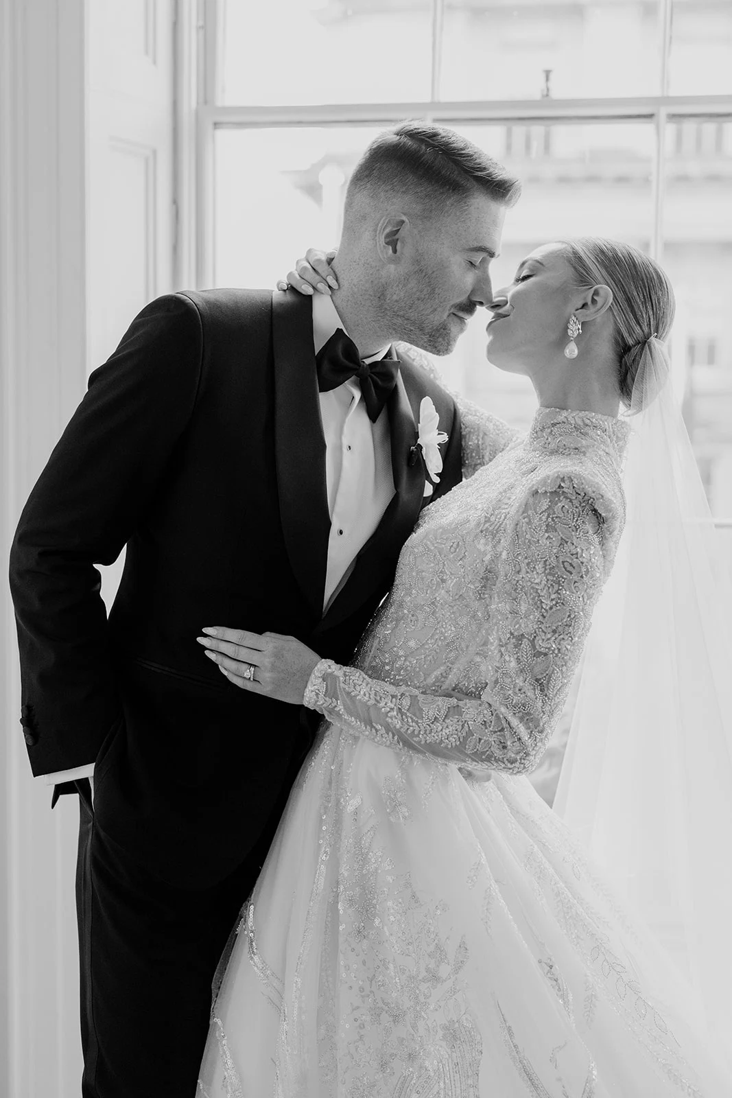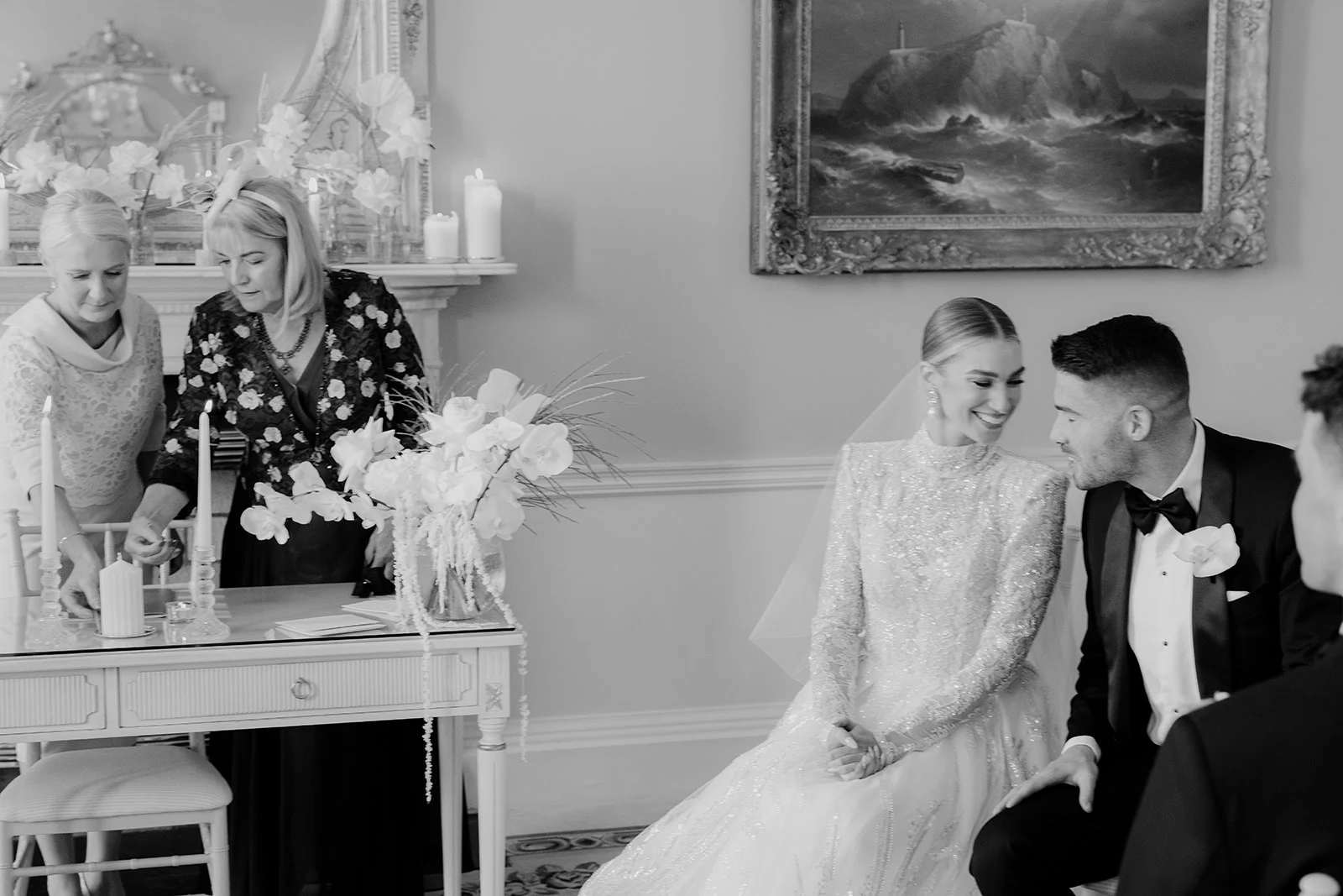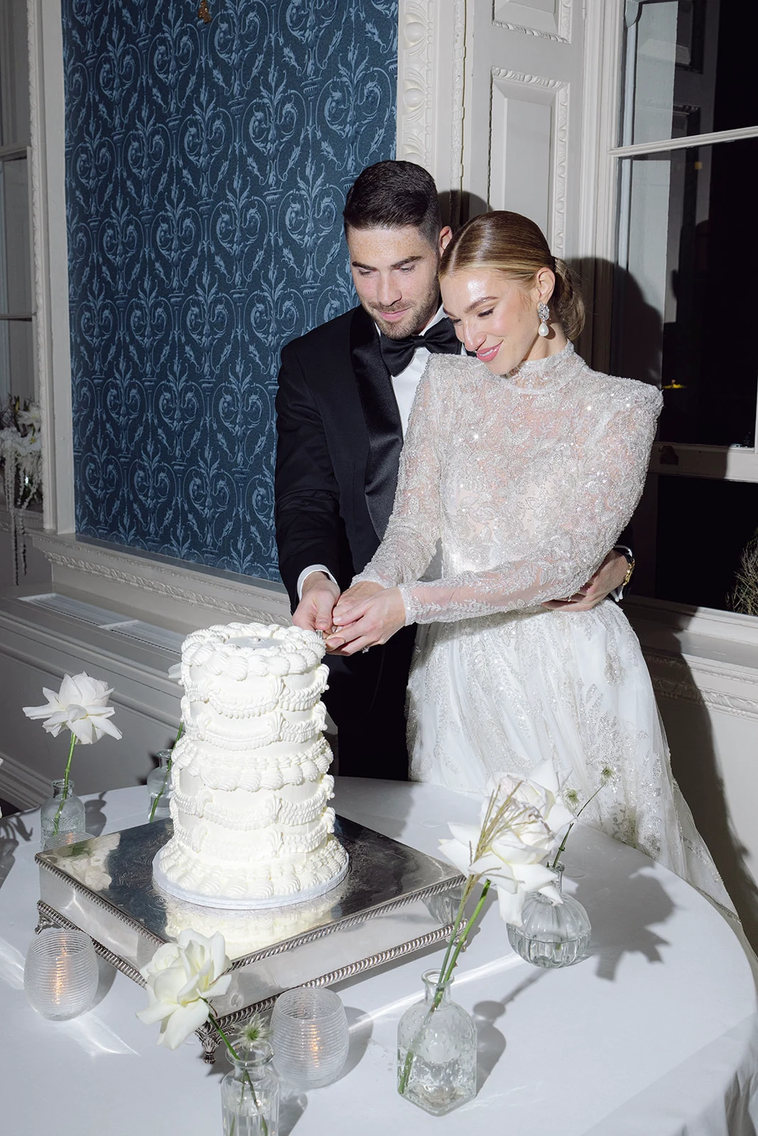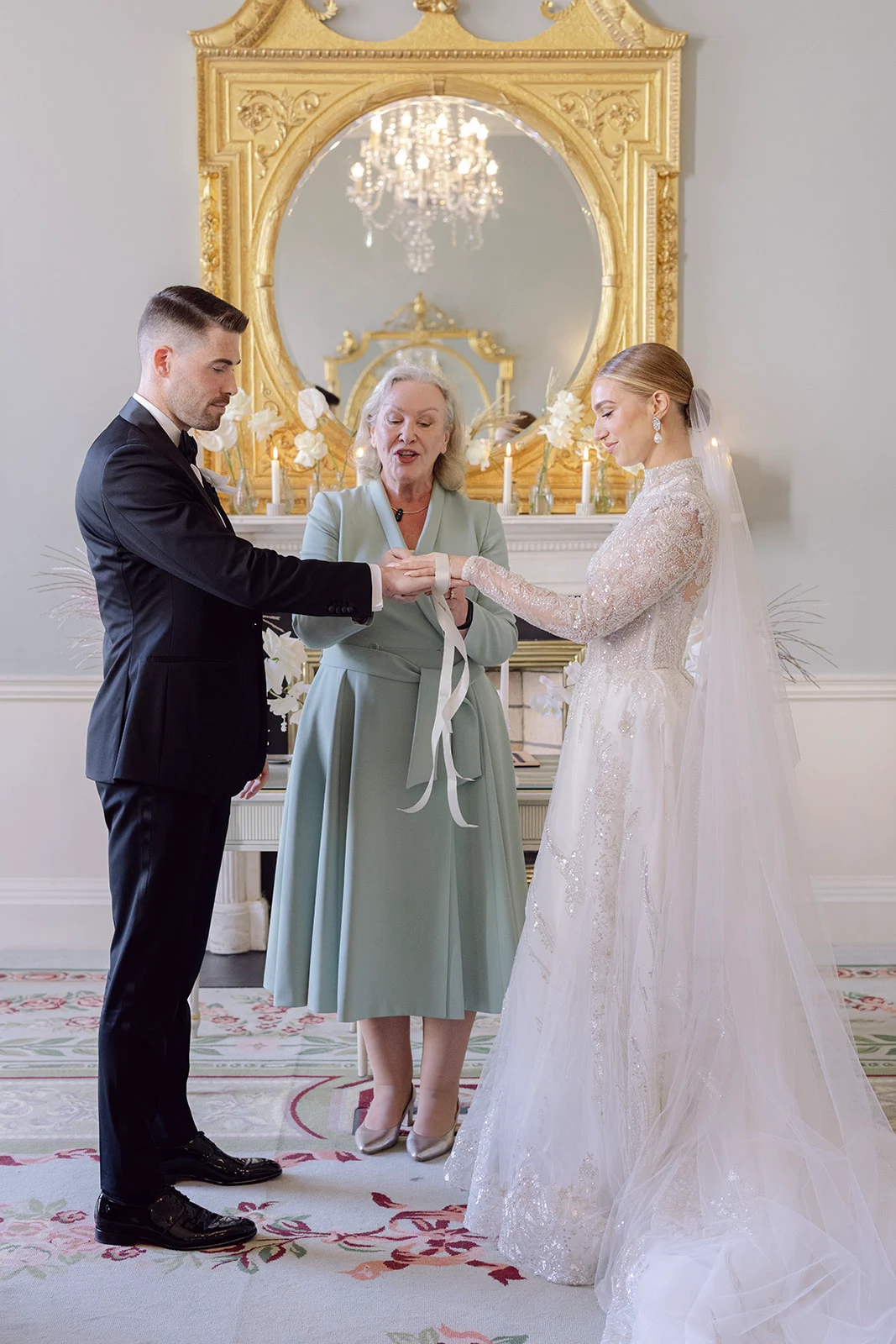 As The Merrion is part of such a gorgeous, restored Georgian townhouse with high ceilings, chandeliers, and ornate cornicing, we didn’t want to take too much attention away from the beautiful décor. We chose all-white florals, keeping them greenery-free as we wanted an ethereal, intensely white look.