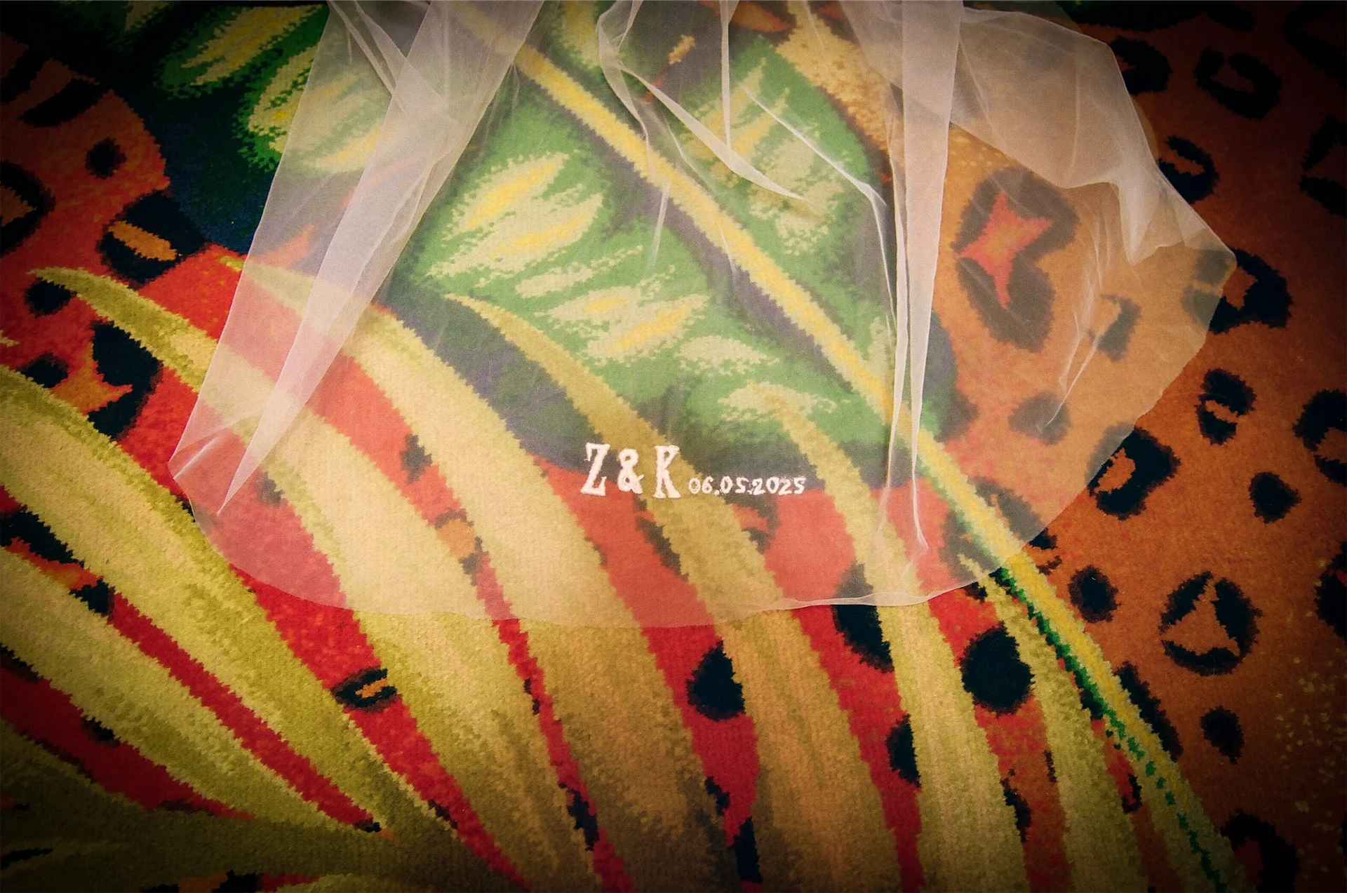 I kept my dress simple and wore a white satin mini dress from Miphai paired with ivory Jimmy Choo heels. The centrepiece was my custom veil. My Maid of Honour, Lauren, embroidered our initials and wedding date, which made it so special. My bridesmaids wore matching black mini dresses paired with pointed bow detail heels.