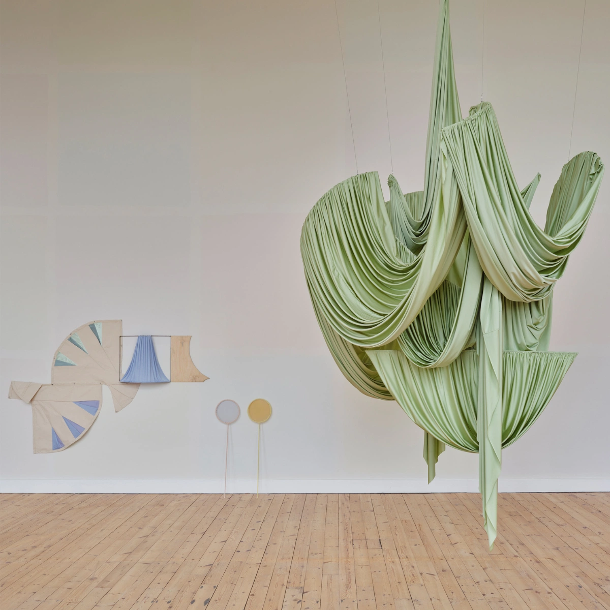 Visitors to A Record of Tenderness will see various techniques and materials employed. There are painting techniques and drawings that have stitch or builder’s chalk used as mark-making tools and welded steel that is sewn together and draped like “abstract brushstrokes”. All the lighting has been removed from the space so that the exhibition changes throughout the day.