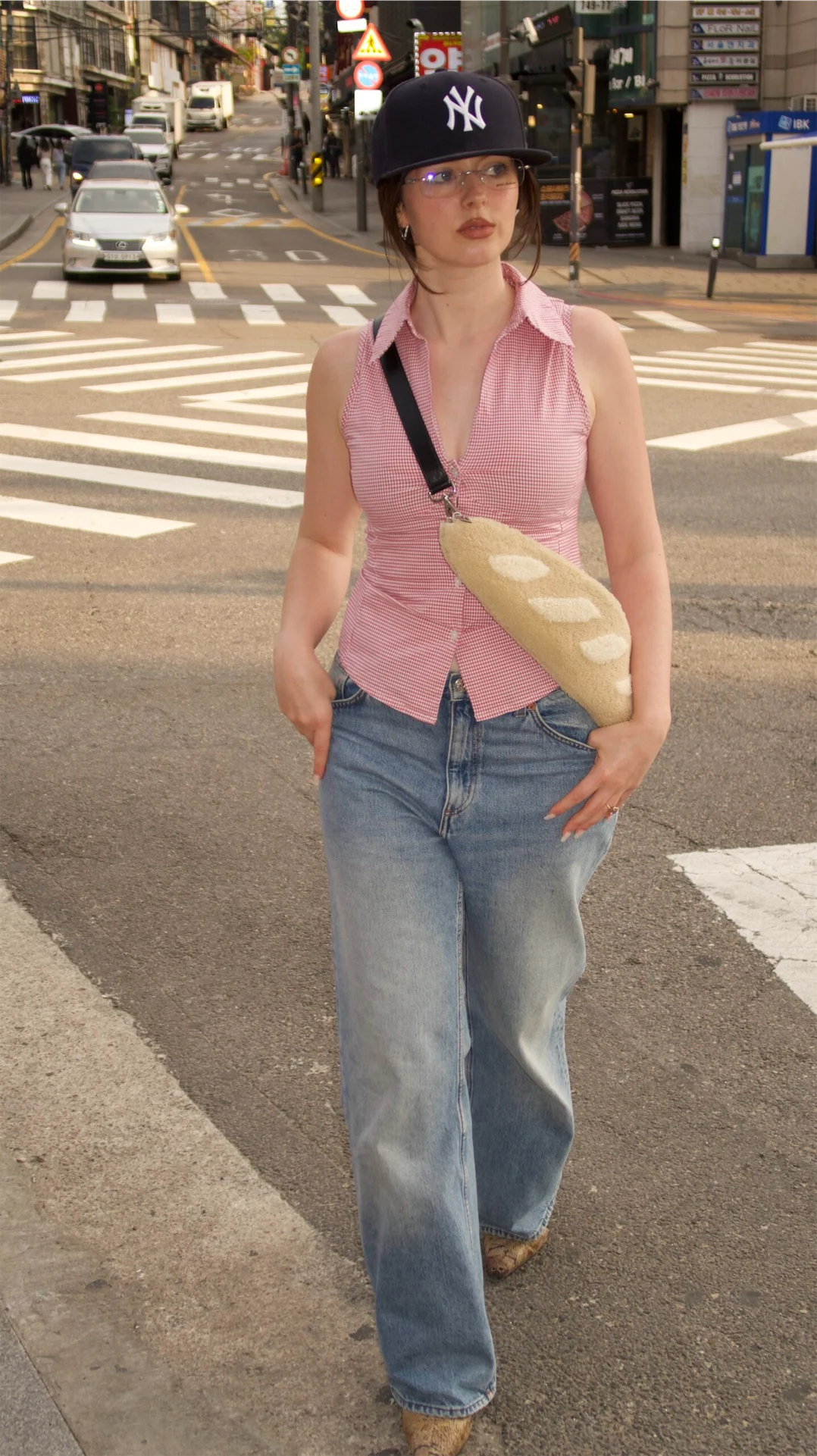 Today, I recreated one of Rihanna’s recent NYC lunchtime looks, featuring my Fendi sheepskin baguette bread pouch. It’s such a fun statement bag, surprisingly comfy and functional too! I’m wearing a Brandy Melville shirt (they’ve finally gotten more generous with sizing, I could never fit into anything there before), old Monki jeans I picked up in London years ago, a New Era hat and vintage snakeskin boots. Lately, my husband and I have been into clear lens glasses, even though we both have good eyesight. They add a subtle, stylish touch to any look. These are from the Korean brand 2000 Archives. Today, I had a lunch meeting and spent most of the day in the office, but this was me heading out for dinner. I tried Brazilian barbecue for the first time, sensational. And if you ever get the chance, try the Brazilian fizzy drink Guaraná – it’s so good.