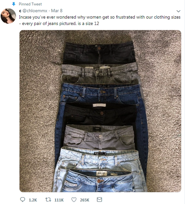 In 2019, Chloe Martin tweeted in frustration a picture of five pairs of jeans in a size 12 from different retailers. The waistline of each was glaringly different and thus the tweet went viral. Women from around the world discussed their experiences and the effect it had on them and their confidence.