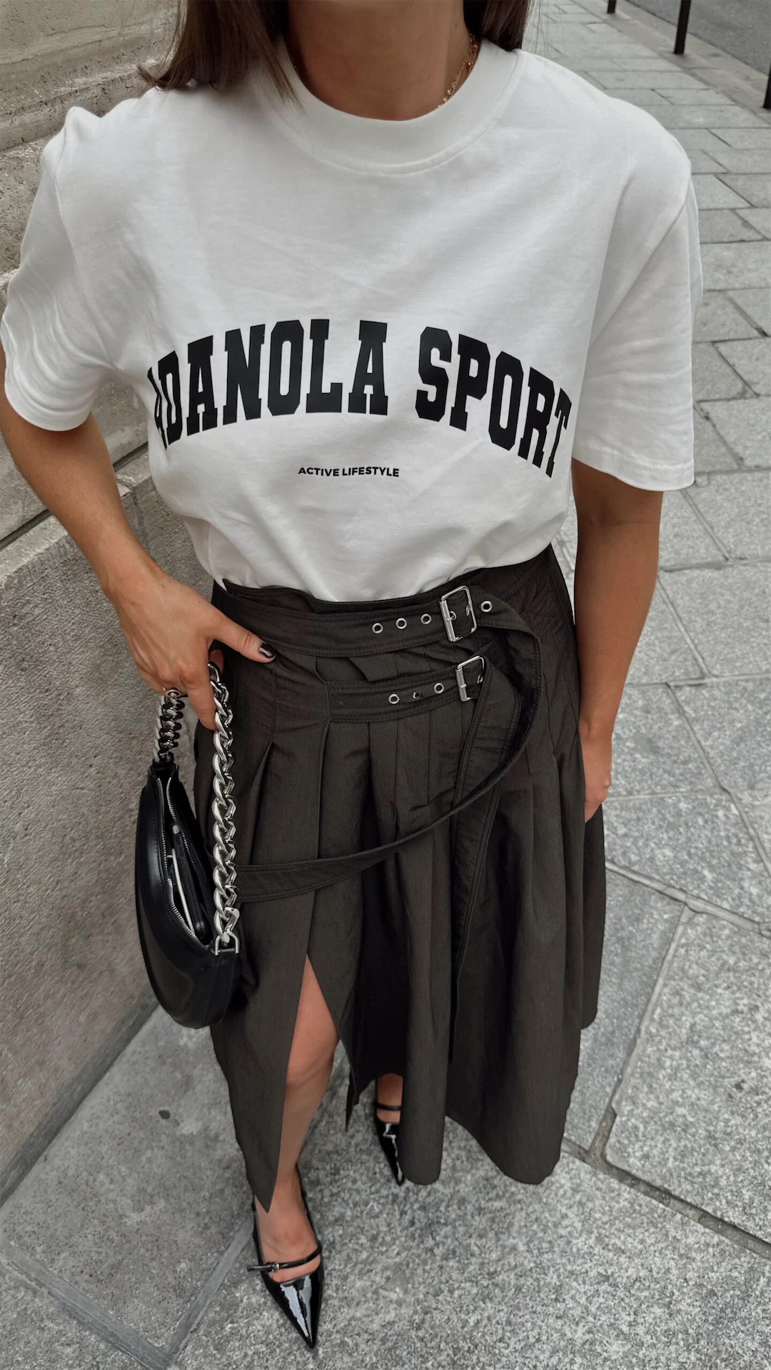 I don’t have a lot of T-shirts in my wardrobe but I love this one from Adonola. It feels nice and structured yet still soft. My skirt is from Zara. I have had it a few years and seldom wear it but it’s one that I always love wearing whenever I pull it out. Pleated skirts can sometimes feel a little boxy on me but as this one has a slit and buckle detailing, it feels a little more edgy. My shoes are Primark and as soon as I saw them I thought they looked very Prada! My bag is from Zara. I love the chunky chain detail of this one.