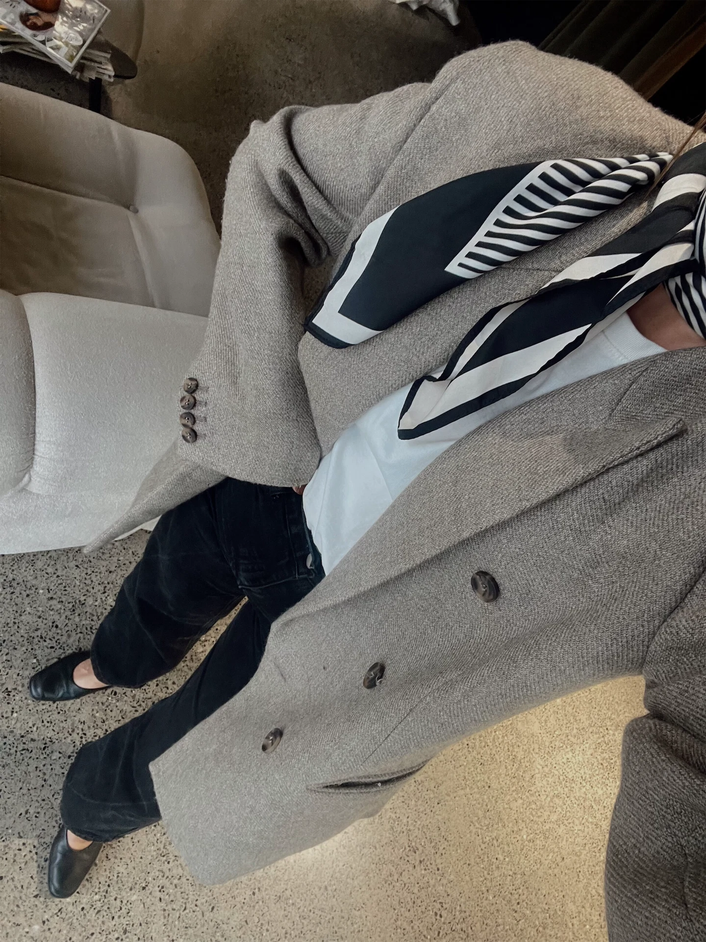 I dedicate Mondays to catching up on admin from the weekend and to getting organised for the week ahead. I am usually at The One and choose to wear something comfortable yet presentable. Today I am wearing a white T-shirt from COS, Black straight-leg jeans from Dr.Denim and an oversized neutral blazer from ROHE at Beautiful South with large shoulder pad. I love anything with a shoulder pad! I think it gives great structure and looks very chic. My pumps are from Marks & Spencer. To this outfit, I have added a printed neck scarf – I have always loved wearing these. I think this one adds some interest to the outfit and for me, brings it together.