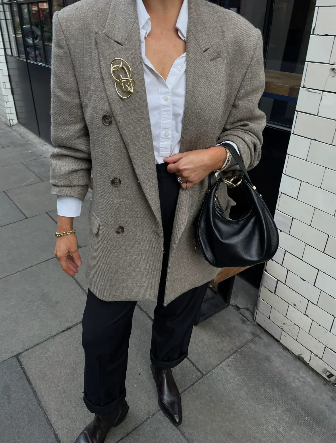 Another day, another neutral! This blazer, as you can see ,works overtime in my wardrobe and is so versatile. I do believe in investing in a piece every now and then that will seamlessly fit into your everyday and that you can mix and match with affordable pieces. I invested in this blazer a few years ago and at the time I thought – am I mad spending on a blazer?! Way back when on my styling course, my mentor told me that a coat is the first piece of clothing someone will see on you and that it shouldn’t be an afterthought. That stuck with me and since then, a coat is my most considered piece. Today I’m wearing the blazer with a Primark shirt, H&M trousers and a brooch from COS. I think the brooch adds a little bit of interest to this outfit. My boots are from Massimo Dutti and my bag is the same Somas one (another piece I wear on repeat as you can see!).