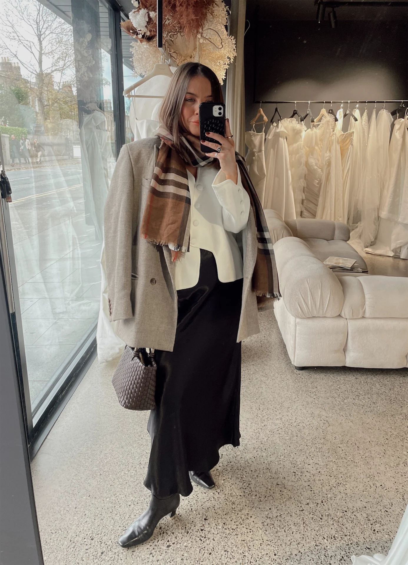 Today I have lots of meetings so aI m a little bit more dressy. This skirt is one I wear a lot, it’s from Sinead Keary The Label. My cardi is also from Sinead Keary, I adore the asymmetric and button detailing in this. I always look out for small details in a piece of clothing, it can really elevate an outfit in my opinion. My blazer is from ROHE and my scarf is Burberry. This scarf was an investment piece for my wardrobe this year. It’s timeless and classic and fits into my everyday life. It’s also reversible so I can wear the alternative colour way, depending on what I’m wearing. My boots are from Russell & Bromley. The low heel is perfect for on-the-go and the soft leather is very comfortable. My bag is from H&M.