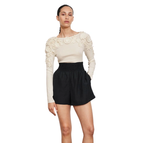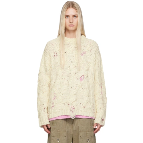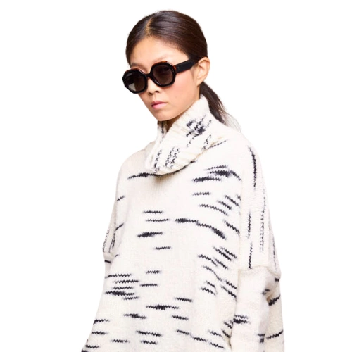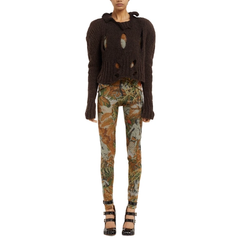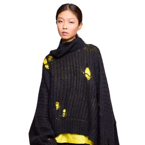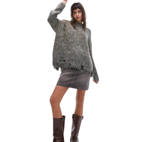 Distressed and ripped knitwear emerges as a rebellious trend for AW24, injecting an unexpected edge into the season’s cosiest staples. Far from the pristine knits of past winters, this year’s pieces embrace imperfections, with intentional rips, frays, and unravelling threads that add a raw, grunge-inspired allure. Brands are transforming traditional silhouettes—think oversized sweaters, slouchy cardigans, and fitted turtlenecks—by incorporating asymmetrical cuts and distressed detailing that exude a sense of nonchalant cool. Wear this wool and alpaca mix open work sweater from Ecru Studios as a juxtaposed layer over a delicate slip dress to give a modern edge to a feminine look.