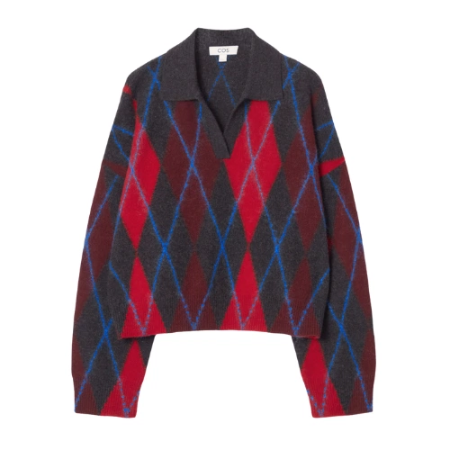 Argyle knits also get a sophisticated update for AW24, stepping away from their preppy roots to embrace a modern, edgy aesthetic. Designers played with scale, colour, and texture, transforming the classic diamond pattern into something fresh and unexpected. Oversized argyle motifs in moody, monochromatic tones bring a sense of drama to sweaters, that feel graphic and contemporary like this COS collared knit.