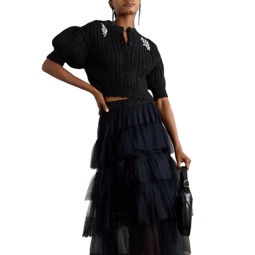 For autumn, knitted sweaters make a bold entry into the realm of evening wear, challenging the traditional notions of after-dark dressing. No longer just for casual outings, these sweaters are being reimagined with intricate designs, luxurious fabrics, and twinkling embellishments that make them perfect for an elegant night out. The cropped crystal-embellished scalloped cable-knit alpaca-blend cardigan from Simone Rocha will elevate any outfit, or the camel mohair embellished knit from H&M paired with this season’s new long full skirt can be your go-to look for an evening soirée.
