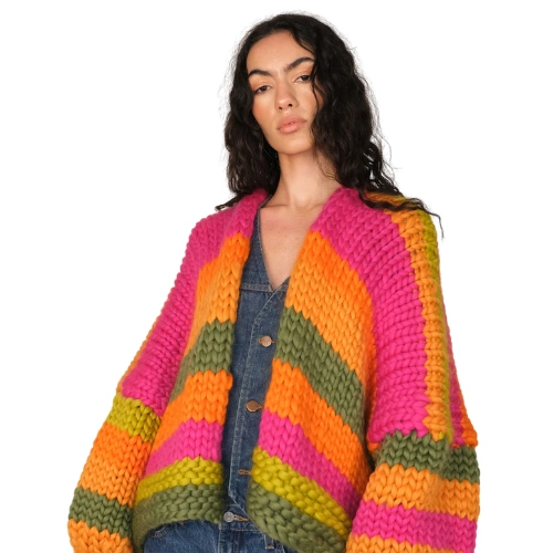 Irish brand Urban Aran’s colourful merino wool cardigan is a perfect example of a playful abstract patterned knit.