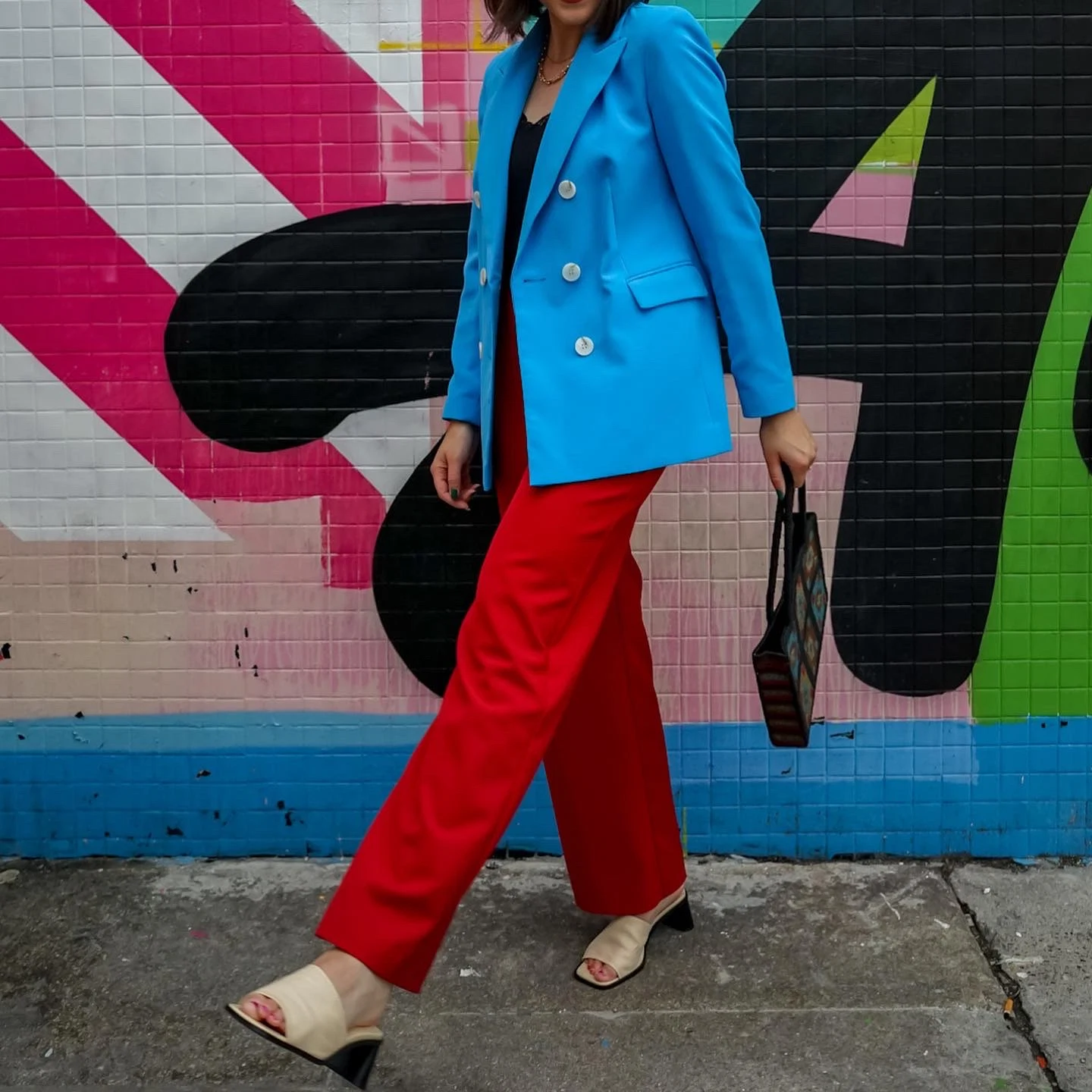 My fool-proof date night outfit is… a pair of high-waisted trousers, a basic top and a heeled mule. I always add colour usually with a blazer or jacket. Accessories are a must, add a hoop earring and a cross-body bag and you’re good to go for that date night whiskey sour.