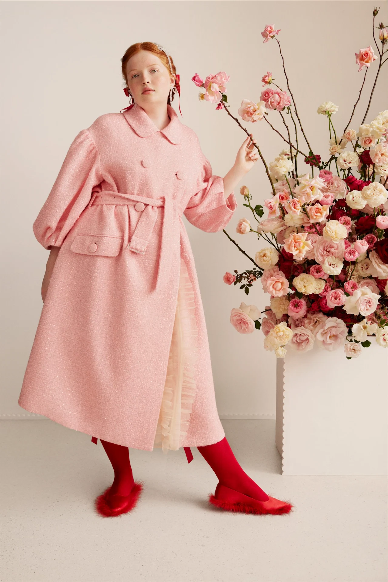 The collection is brimming with the designer’s signature play with texture, shape and colour, from tulle pink dresses and puff sleeves to classic trench coats and bubble-knit cardigans. As with all of Rocha’s collections, her H&M collaboration also includes a signature tweed coat, this time in a tweedy fabric twist of a traditional peacoat.