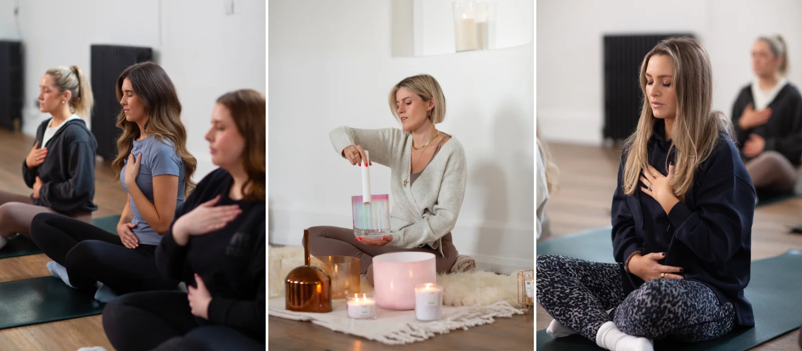 Meanwhile, Audrey opted for the EVERYHOUR high-waisted leggings in brown, styled with the AFTERCLASS ribbed wrap-front cardigan – the perfect layer for the sound bath session and an ideal addition to any yoga look.