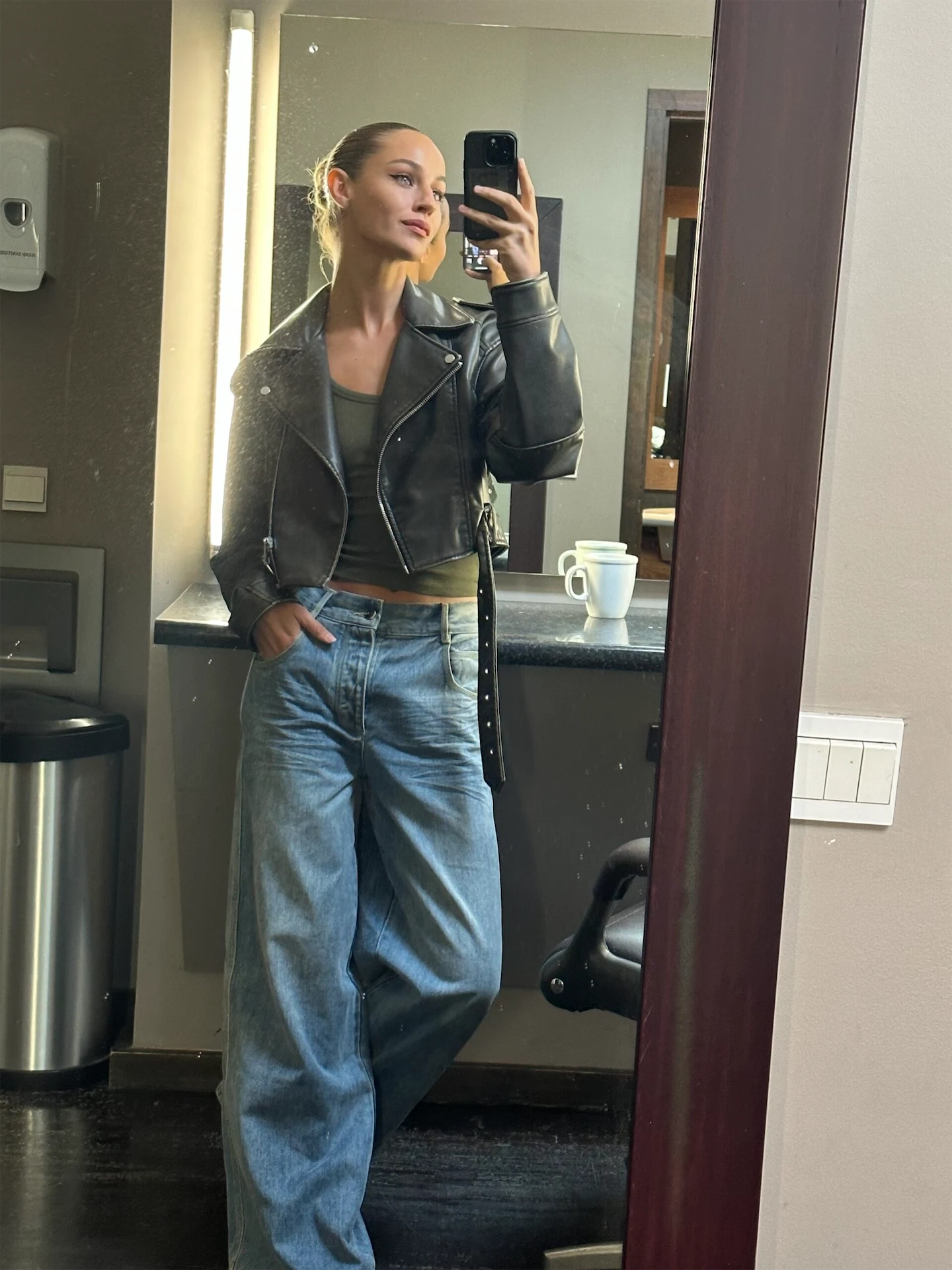 Today was a shoot day, so once again I tend to go to set pretty comfy as I’m only in my own clothes for hair and make-up and lunch. It was actually quite a nice day when I left my house, so I went with a khaki (can you tell green is my fave colour?) tank from Zara, a cropped faux leather jacket also from Zara and jeans from Ronny Kobo.