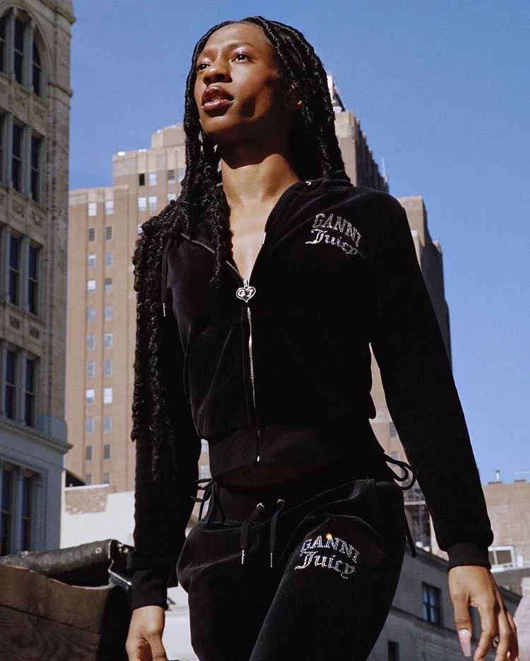 Combining Juicy’s signature candy-coloured tones and celebrity nonchalance with Ganni’s playful edge and cool girl aura, the new line also stays true to Ganni’s eco-aware ethos and is made using a mix of organic cotton, pre-consumer recycled cotton and recycled polyester. And in keeping with the brand’s commitment to inclusivity, all garments will be available in a range of sizes from XXS up to 4XL.