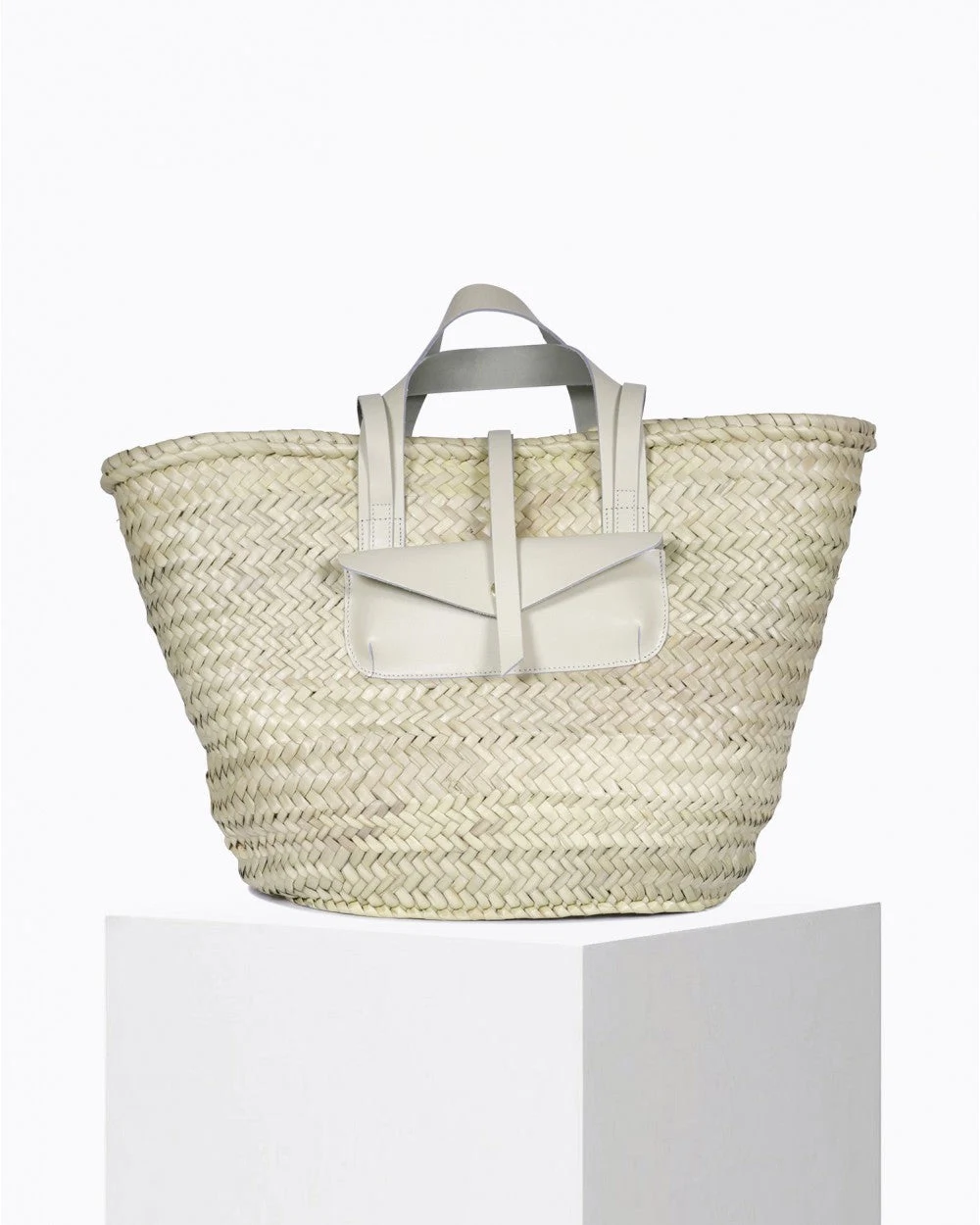 Floral ruffled silk and linen top, Alémais, €445 at Brown Thomas. Beige cotton wide leg trousers, Hache, €440 at Emporium Kalu, Naas. Oversized woven basket, Craie Studio, €120 at Gallery 9, Naas.
