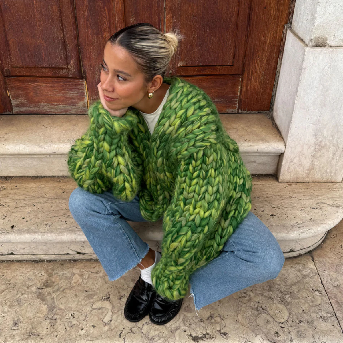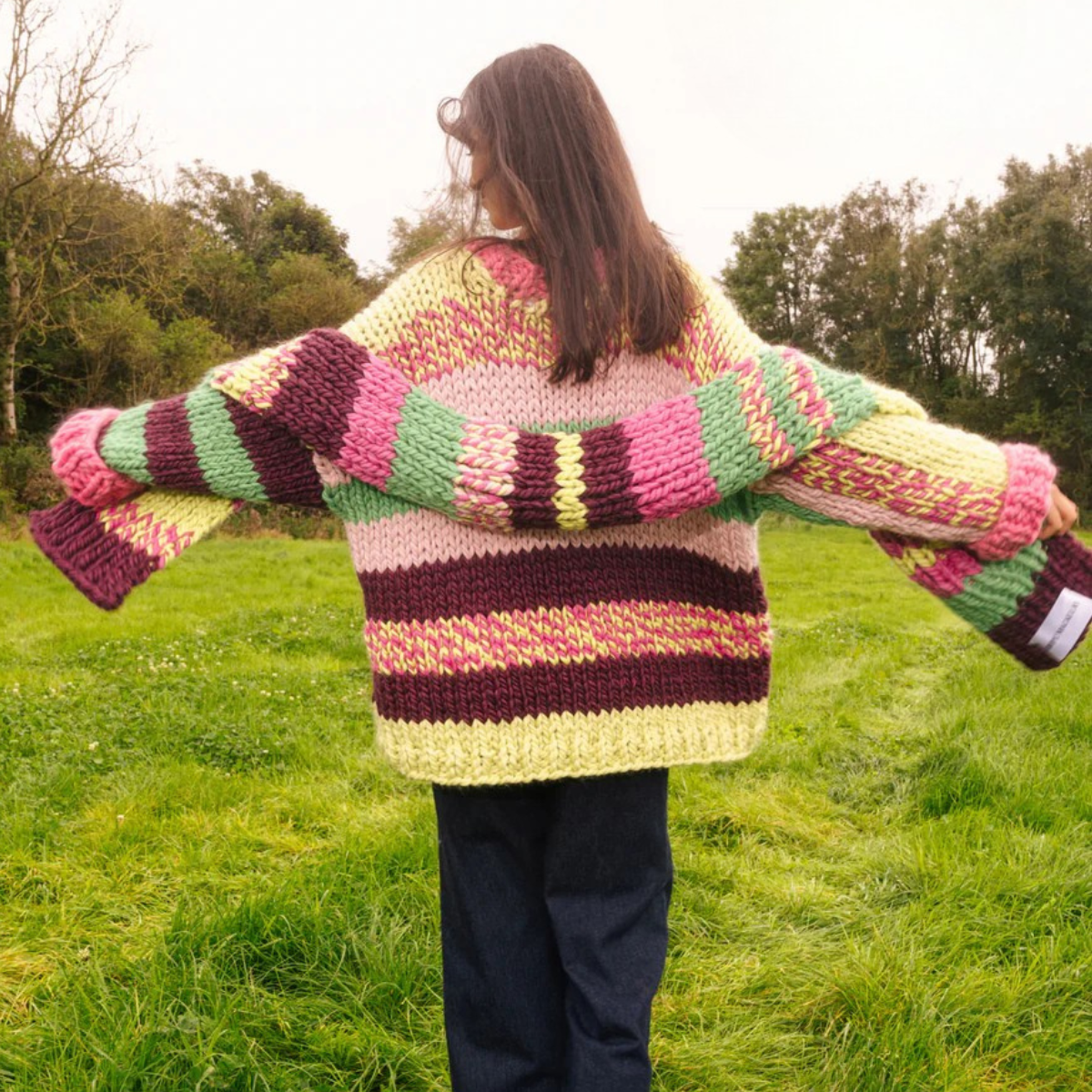 We create statement, handcrafted knitwear such as our signature Colossal Knit cardigans, hand embroidered sweaters, blankets, cushions, jeans and printed garments too. Every piece is designed by me, and our knits are hand-knitted by our team of local artisans using luxurious merino wool and our own bespoke Irish alpaca yarn, spun just minutes from our studio.