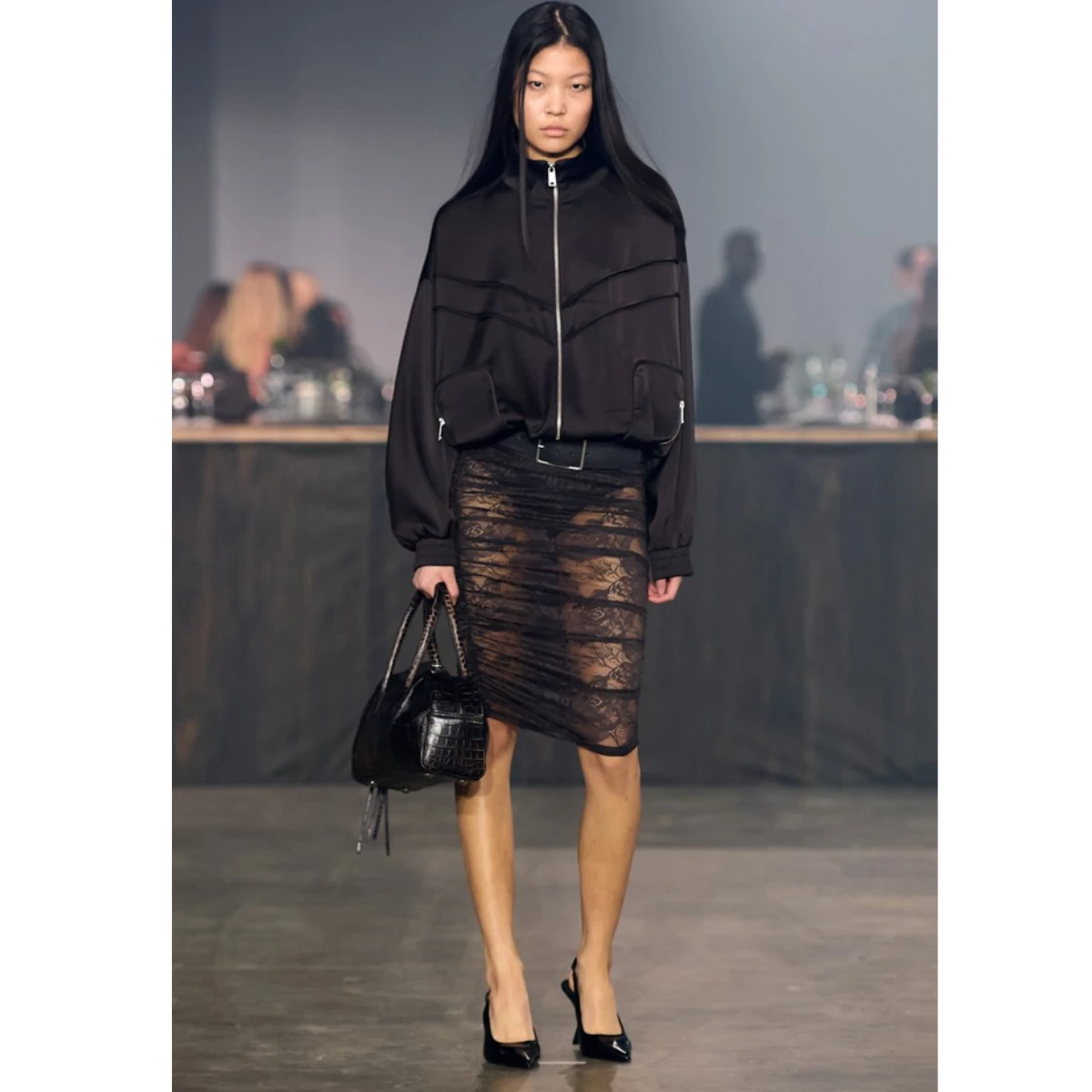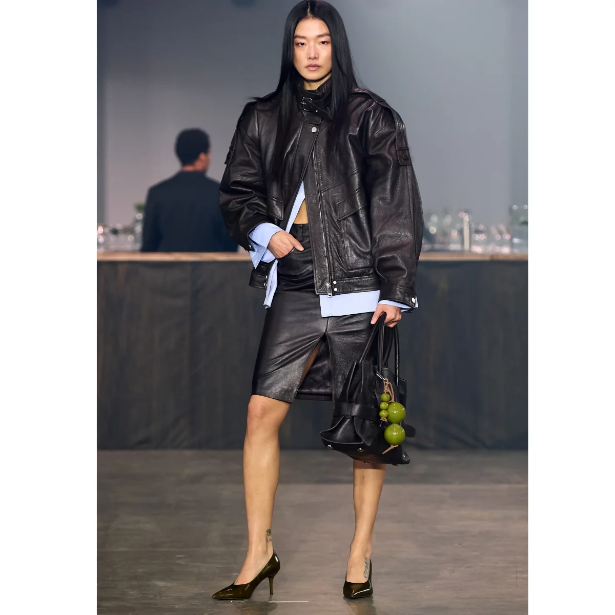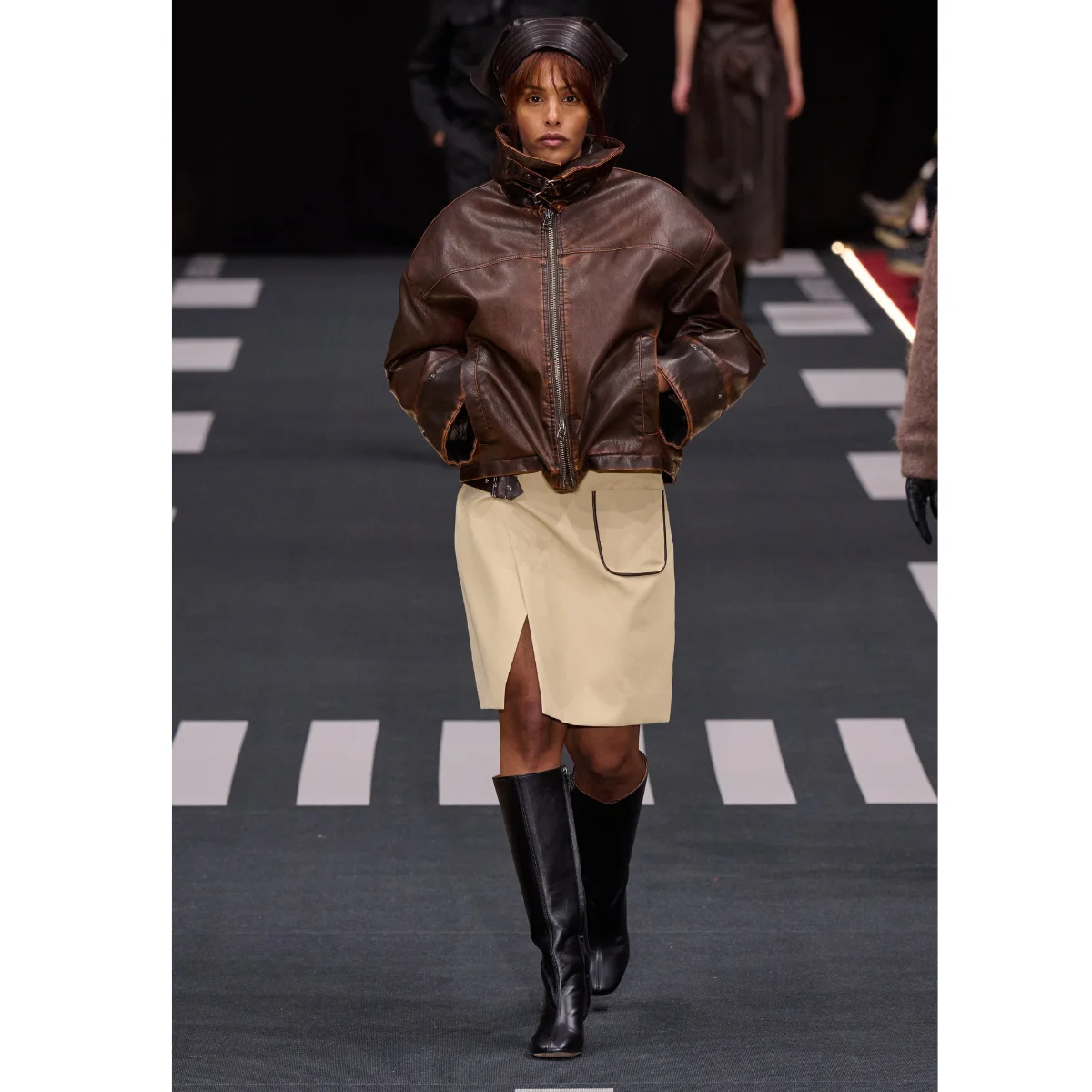 Apart from faux fur coats, if you’re looking for the defining outerwear of the autumn season, it’s the bomber jacket. Black bomber jackets were the most popular among designers like Forza Collective, Gestuz, and MKDT, styled with everything from leather to sheer skirts. Bomber jackets were a natural fit at Baum’s aviation-themed show, with brown leather styles shown with utility skirts and leather trousers.