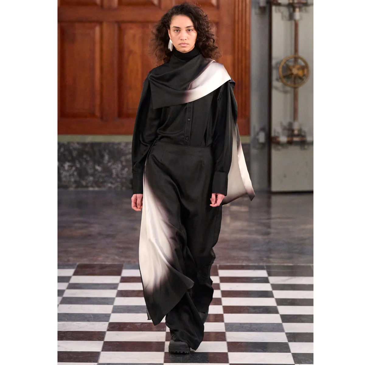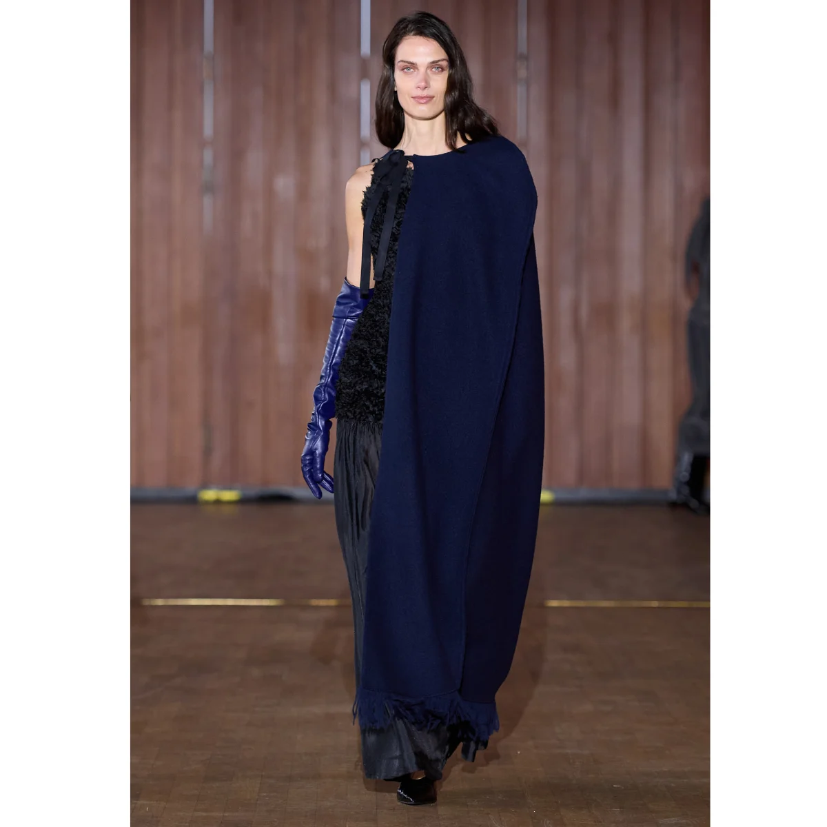 Trailing fabrics and overlays were a mainstay on most Copenhagen catwalks, creating interesting and striking silhouettes. Scarf-like overlays came in leather at Herskind, while at MKDT, they were integrated into the outfits, layered under blazers and coats for a fresh styling hack to steal come winter. Also, at Herskind, deconstructed mantles were anchored at the shoulder and draped over leggings, blurring the line between cape, shawl and dress. At The Garment, off-centre capes in midnight blue closed the show, layered over black textured dresses and styled with patent navy gloves.