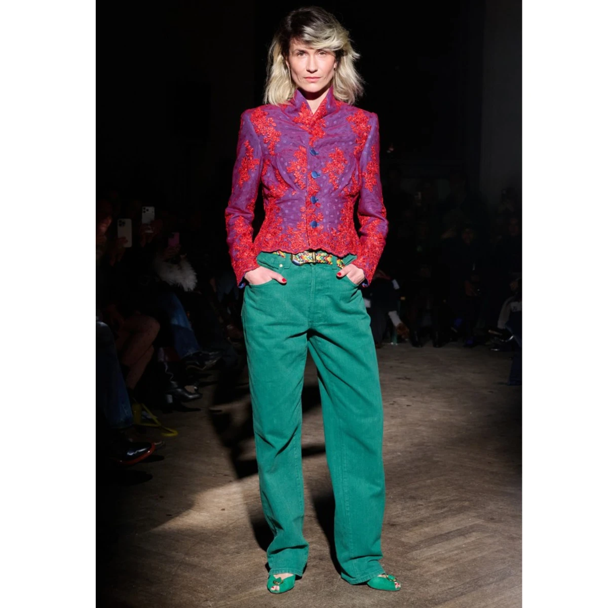 Denim is always a cornerstone of the Copenhagen catwalks, but this season it came with a twist. Instead of traditional indigo or stonewashed, designers leaned into coloured denim, from purple to teal to earthy tones. At Baum, double lilac denim was tempered with leather and grey, giving it a grown-up finish. At Holweizer, double denim again was given a cool-girl makeover, with flocked textures in earthy tones paired with ballet flats and opaque socks.