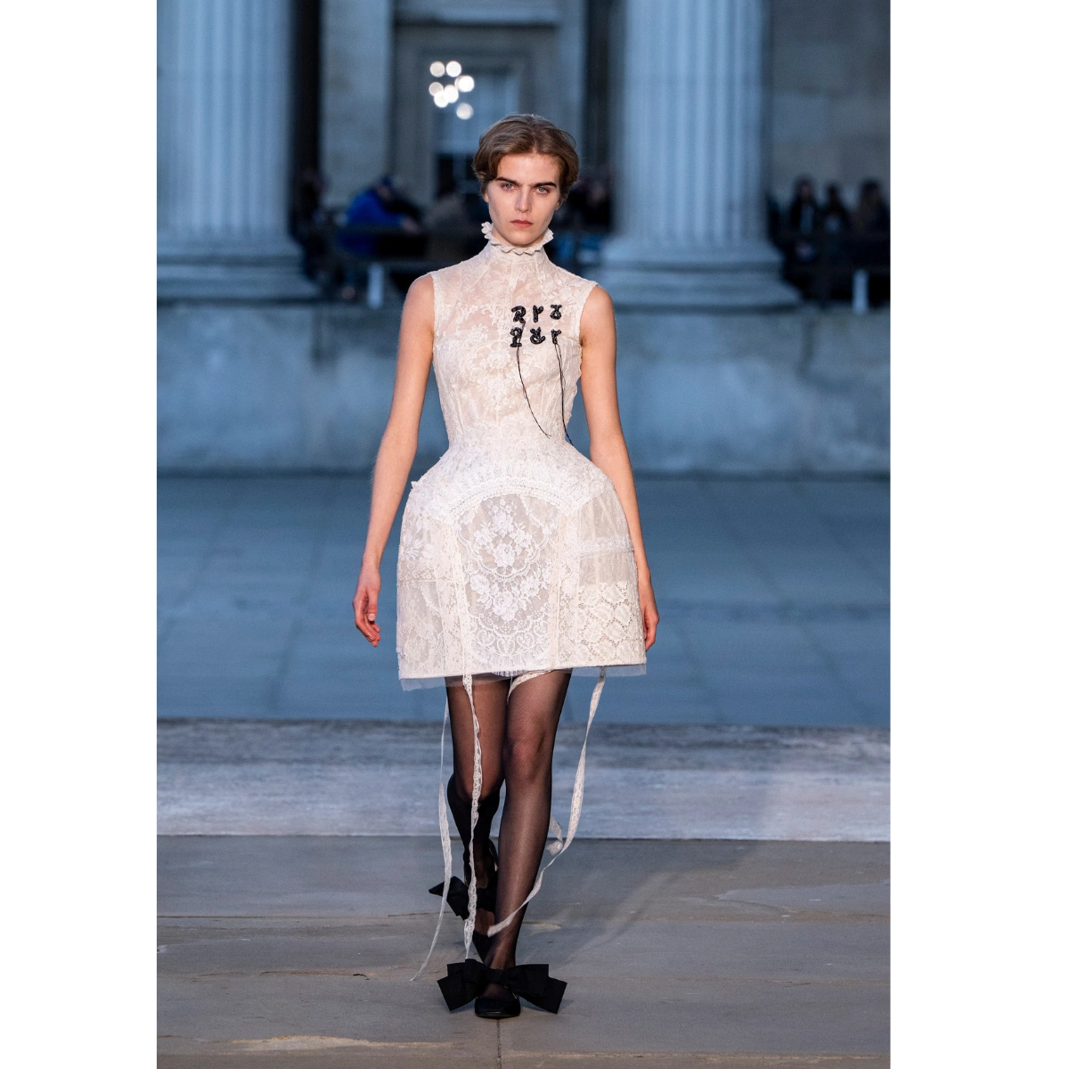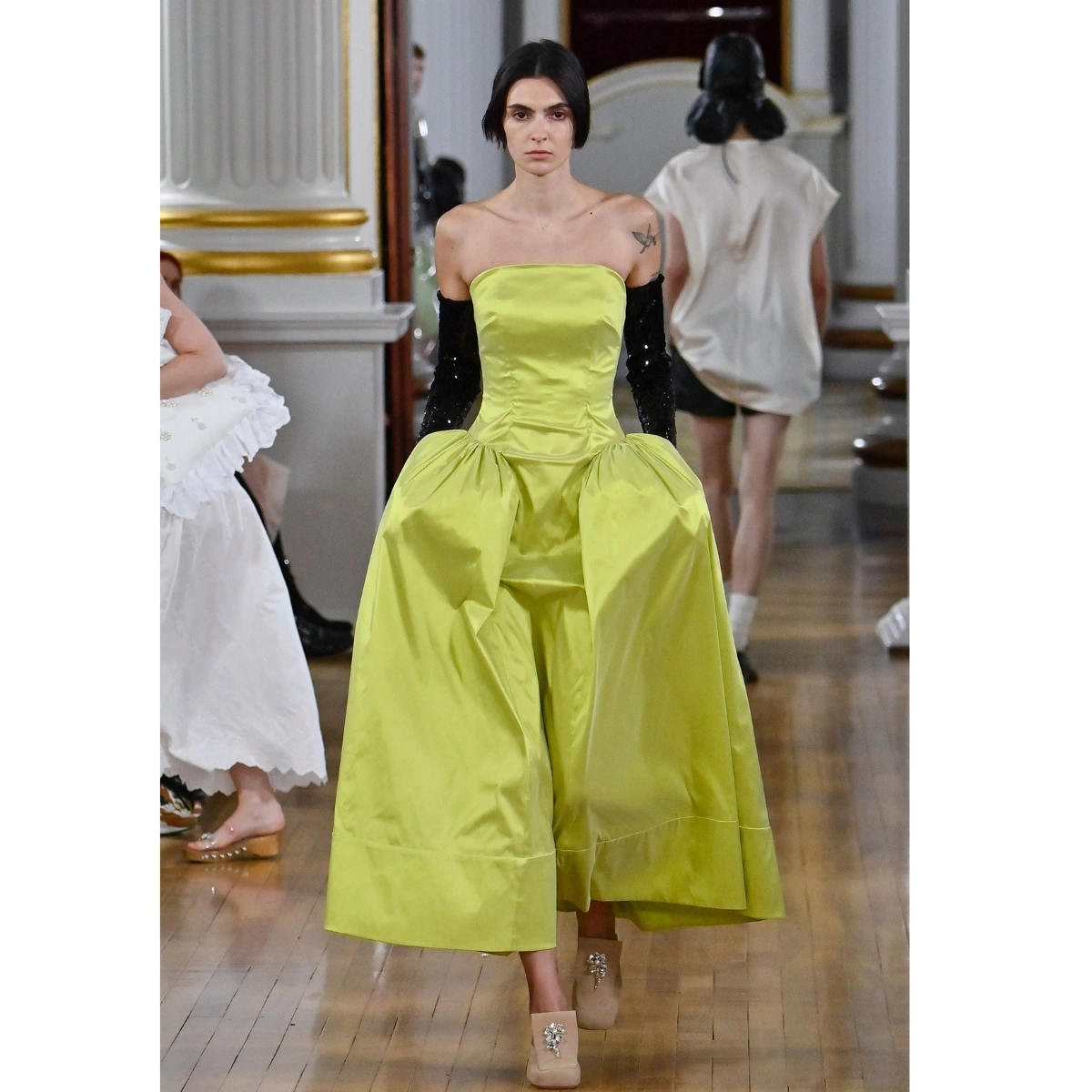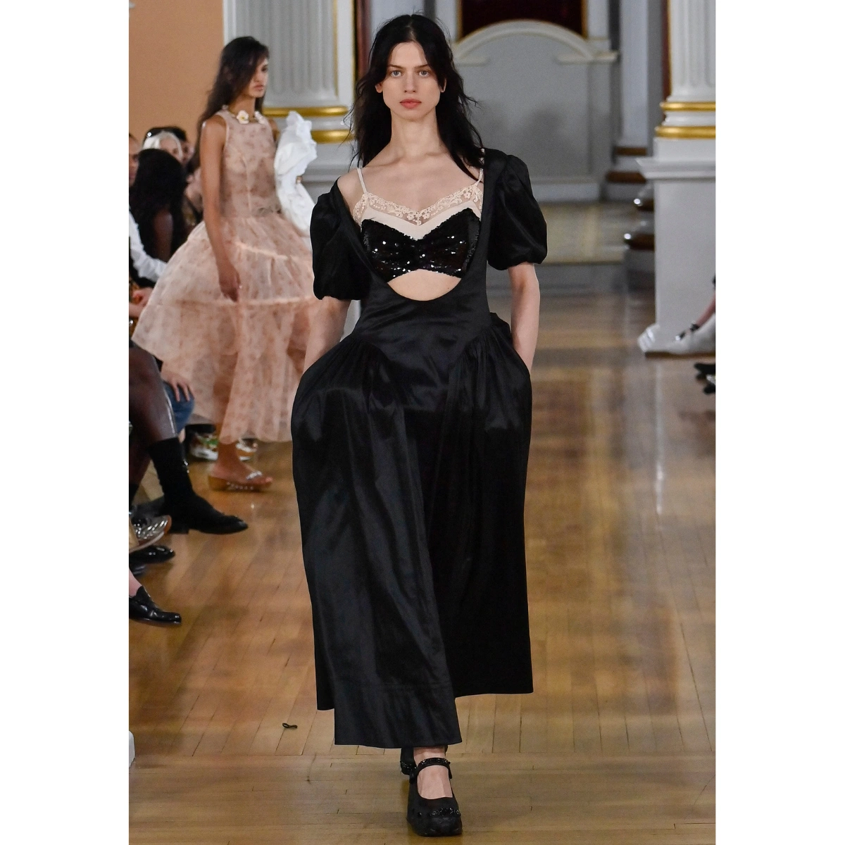 From bustles to balloons to barrels, pumped-up volume and architectural designs filled the runways at London Fashion Week. Designers like Paul Costelloe and Erdem played with exaggerated silhouettes, proportions, and structure. Extreme volume on the hips was the most striking silhouette play, with designers such as Simone Rocha, Erdem, and Toga adding inches through lace and silk designs.