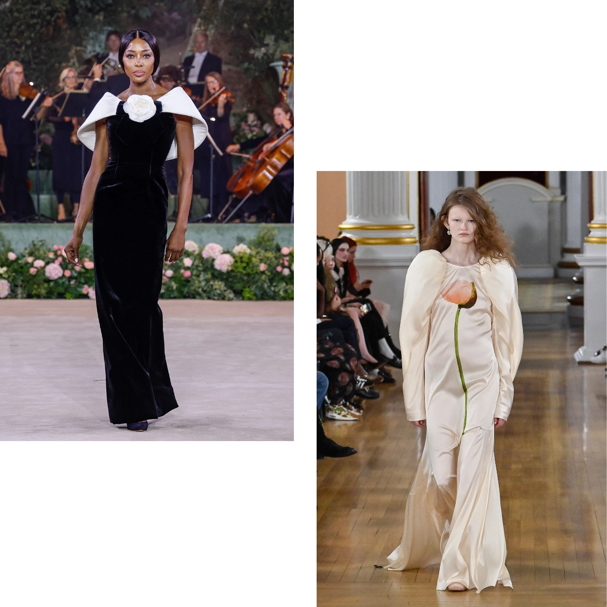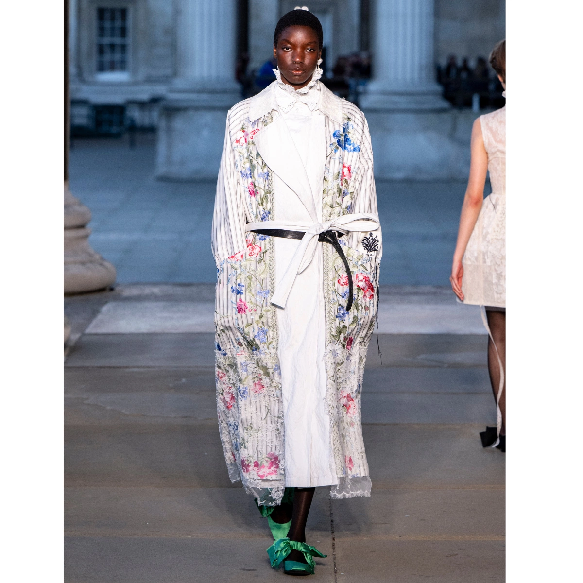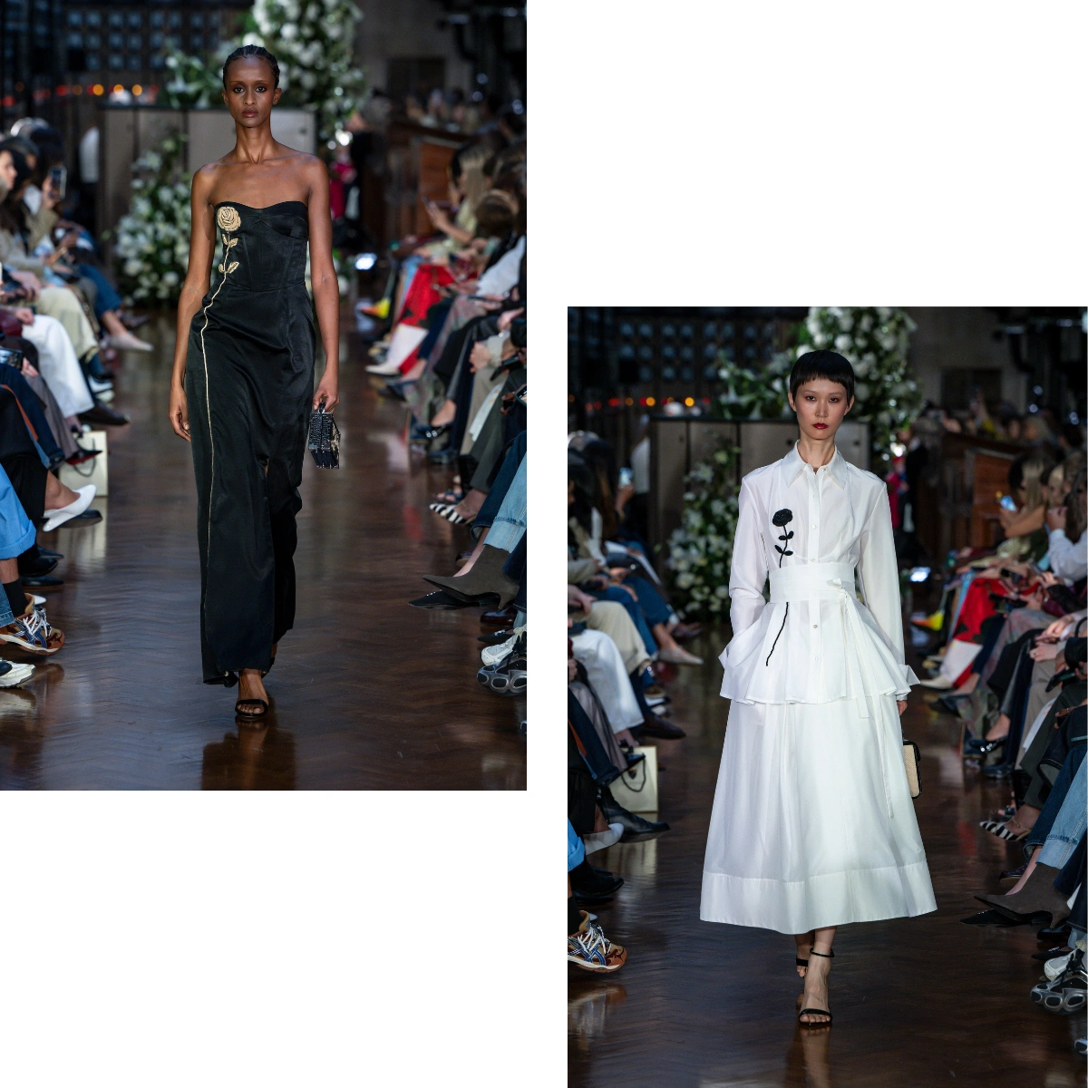 It wouldn’t be spring without a mention of a particular print – floral, but for spring 2026, designers took the pretty print into fresh directions. At Patrick McDowell and Simone Rocha, single-stemmed flowers were etched or painted onto dresses, giving them an artistic feel. While Rocha also used bunches of blooms in a 3D effect on the lapels of the coat and on dresses, adding texture and playfulness.