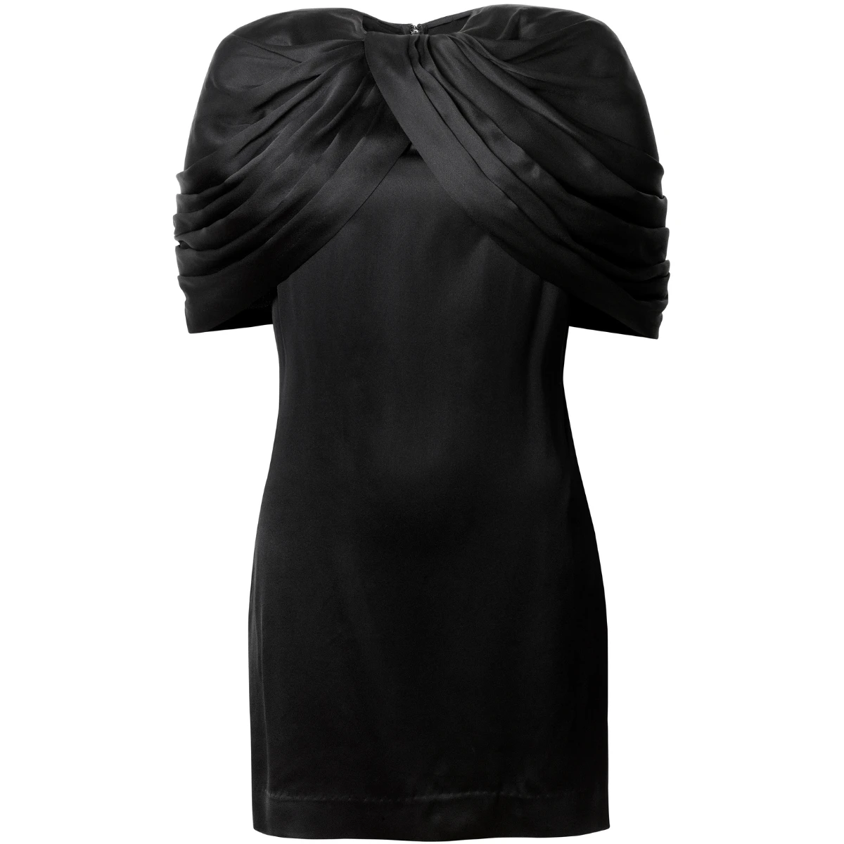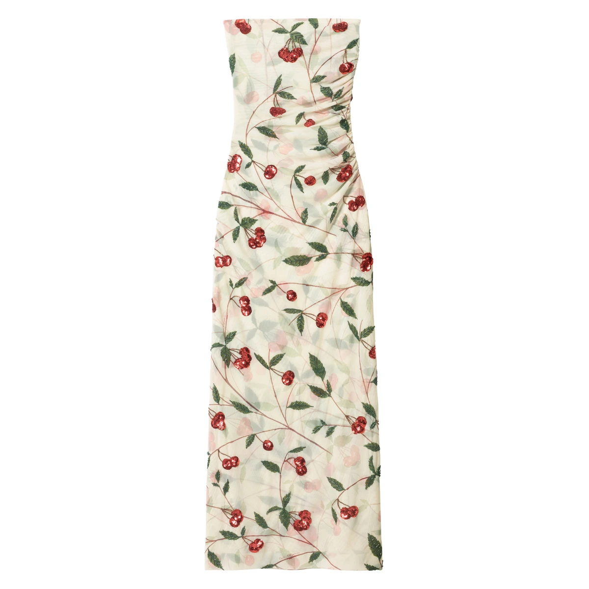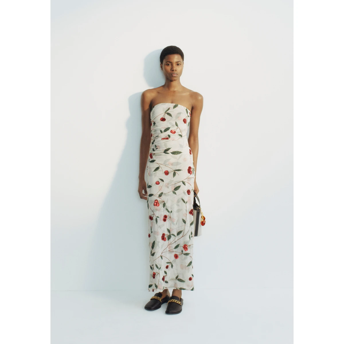 There’s archival cherry print and many bags – six styles in total, from a roomy Falabella chain detail embellished tote to small branded shoulder bags. The eveningwear is beautiful, from chain neck vests and sparkling partywear to a long white gown with a cape-like sleeve that loops into the hem – as is the outerwear; there are trenches, tailored coats and sharp blazers.