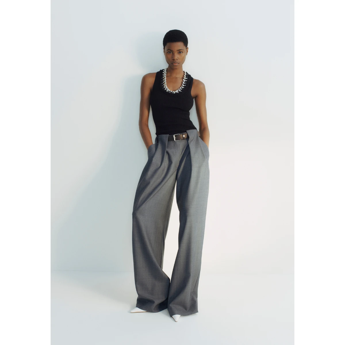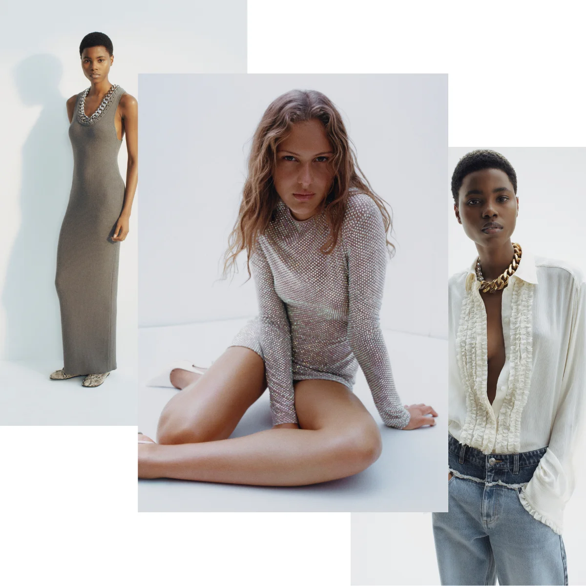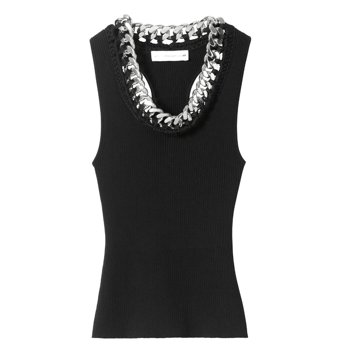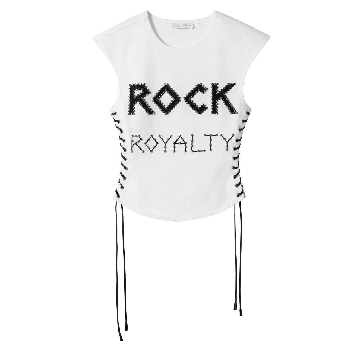 The second Stella McCartney H&M collection features much of the house’s 25-year history and beloved current signatures (Falabella chain dresses and vests and bags and jewellery!) with playful hits from McCartney’s early archive, like bejewelled tops and a white studded white mini tee reading ‘Rock Royalty’.