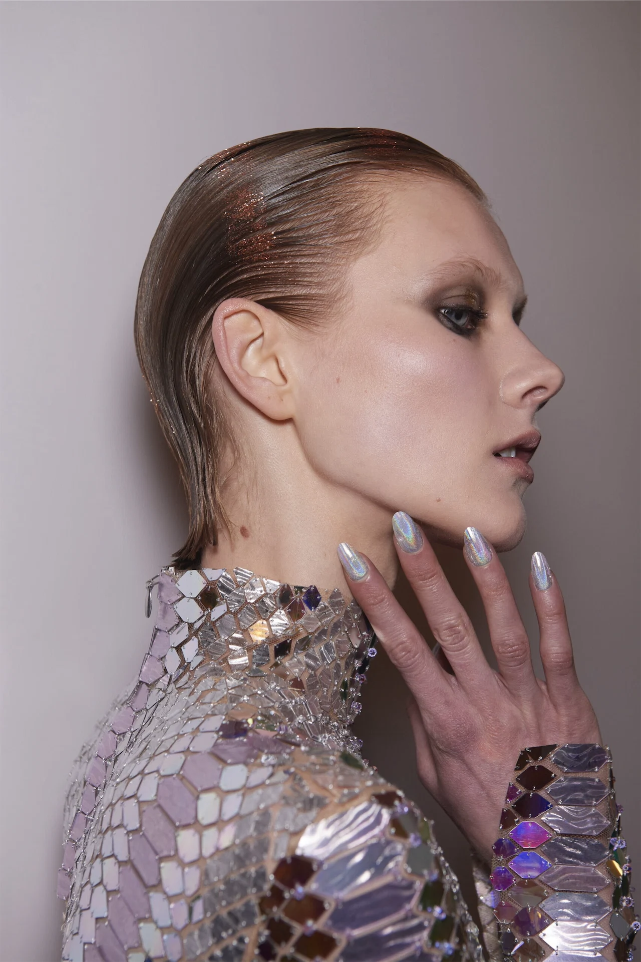 “Embellished hair is a trend showing no sign of going anywhere soon,” says Neill Cooney, Best Bloody Brilliant Blow-dry winner at the IMAGE Business of Beauty Awards 2022. “We have seen every brand come out with heavily embellished hair accessories, from Gucci to Prada to Miu Miu. For a more subtle but equally dazzling result, try glitter hairspray; it can really take a look to the next level with very little effort or fuss. Either apply loose glitter to the hair and secure in place with gel or wax or try a glitter hairspray – spray it vertically up into your hair, as this will allow it to disperse more evenly throughout and not sit all in one spot. You can build up the amount you want in light coats – it never fails to turn heads.”