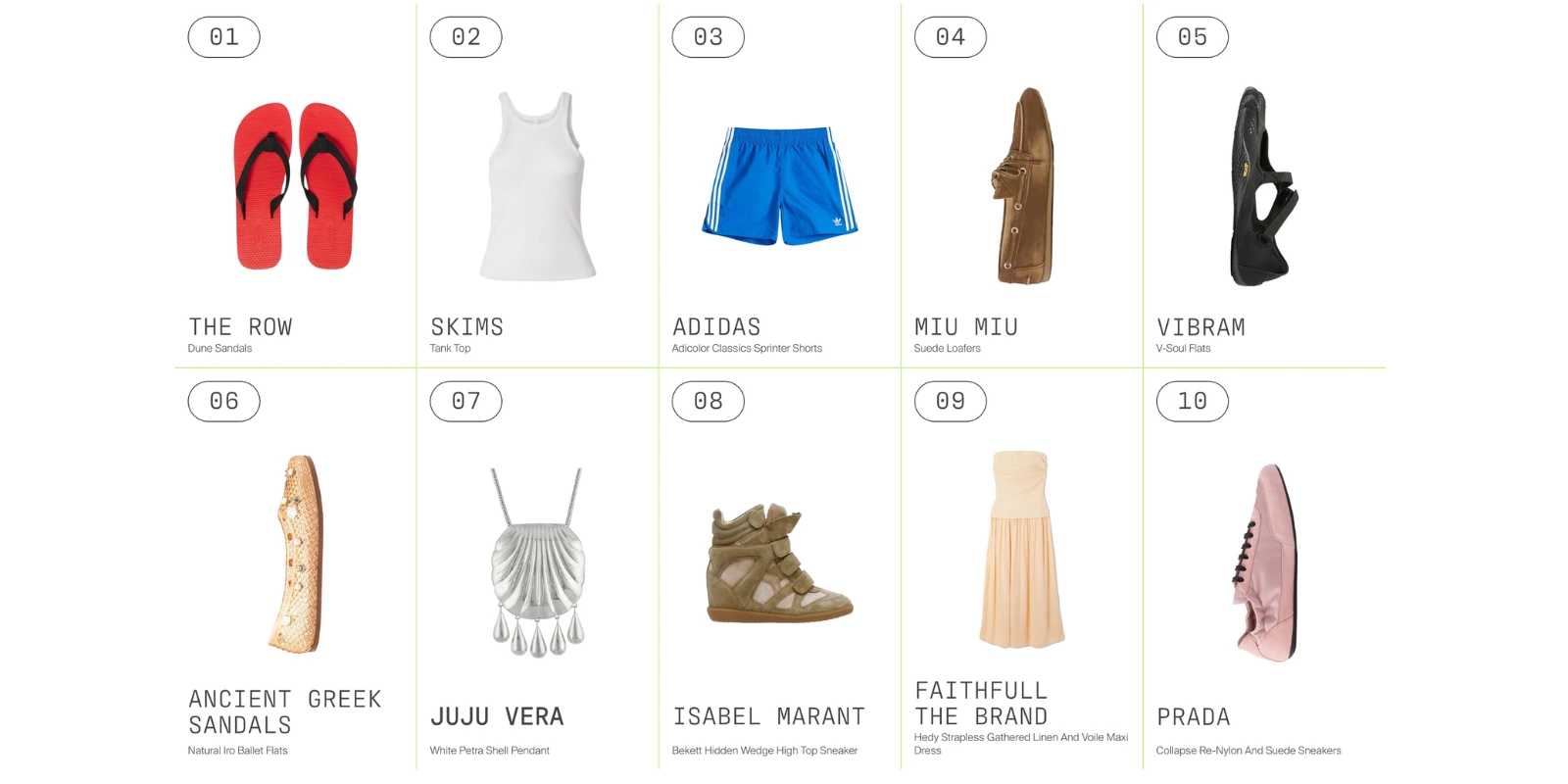 Juju Vera’s shell pendant necklace was number 7 on the list, tapping into the trend of coastal accessories, while you won’t have scrolled long before coming across Faithfull The Brand’s Hedy dress on your feed, or at least a style like it, coming in at number 9. The rest of the list is made up of six pairs of shoes — “a mix of the functional, the nostalgic, and the outright odd,” according to Lyst. The Vibram FiveFinger shoes saw a 110% increase in traffic and the wedge sneaker revival continues— led by continued interest in Isabel Marant’s Bekett style — while Miu Miu brand’s logo-embossed suede loafers ranked 4th in this quarter’s hottest products.