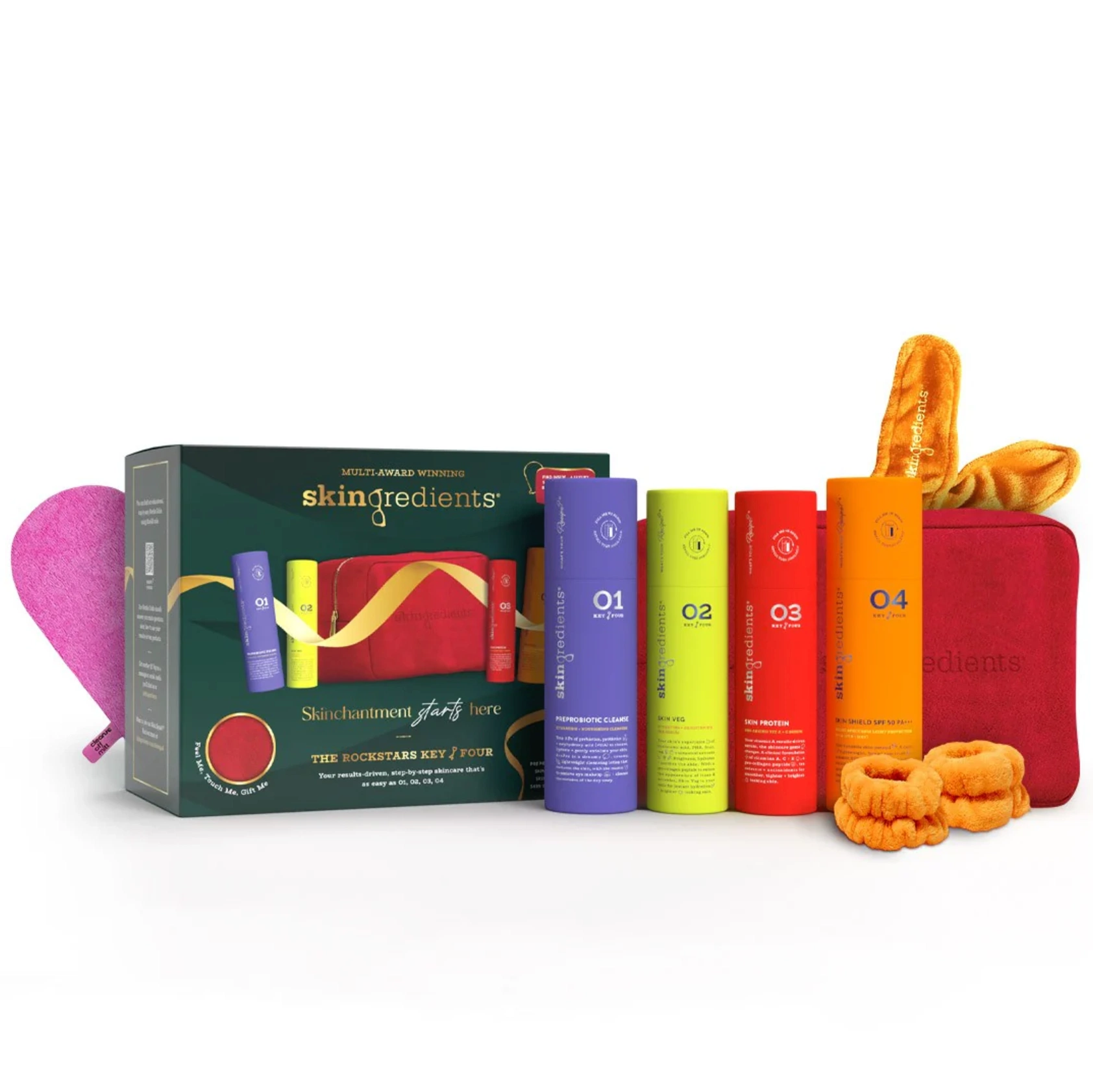 A failsafe gift, the Rockstars Key Four Gift Set contains four products that should form the basis of all skincare regimes, no matter the skin goal. It contains full-size bottles of the award-winning Key Four Collection, plus a luxurious Skingredients velvety beauty bag, handy ‘keep your arms dry’ wristlets, a soft headband, and the beauty tool of the cleansing pros – a Cleanse Off Mitt.