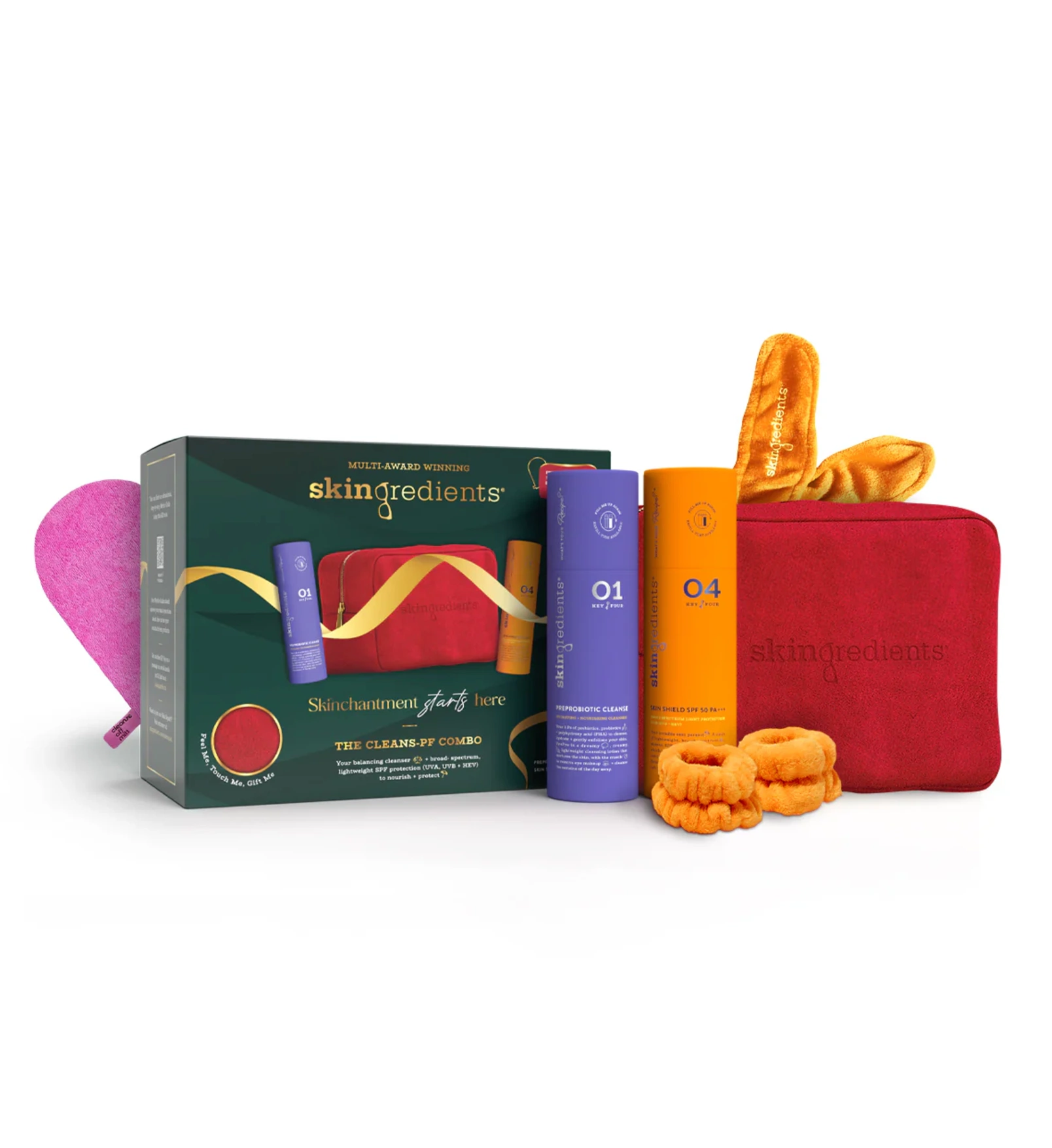 The set also contains a Skingredients Vanity Bag, a Cleanse Off Mitt and handy wristlets to keep your wrists dry.