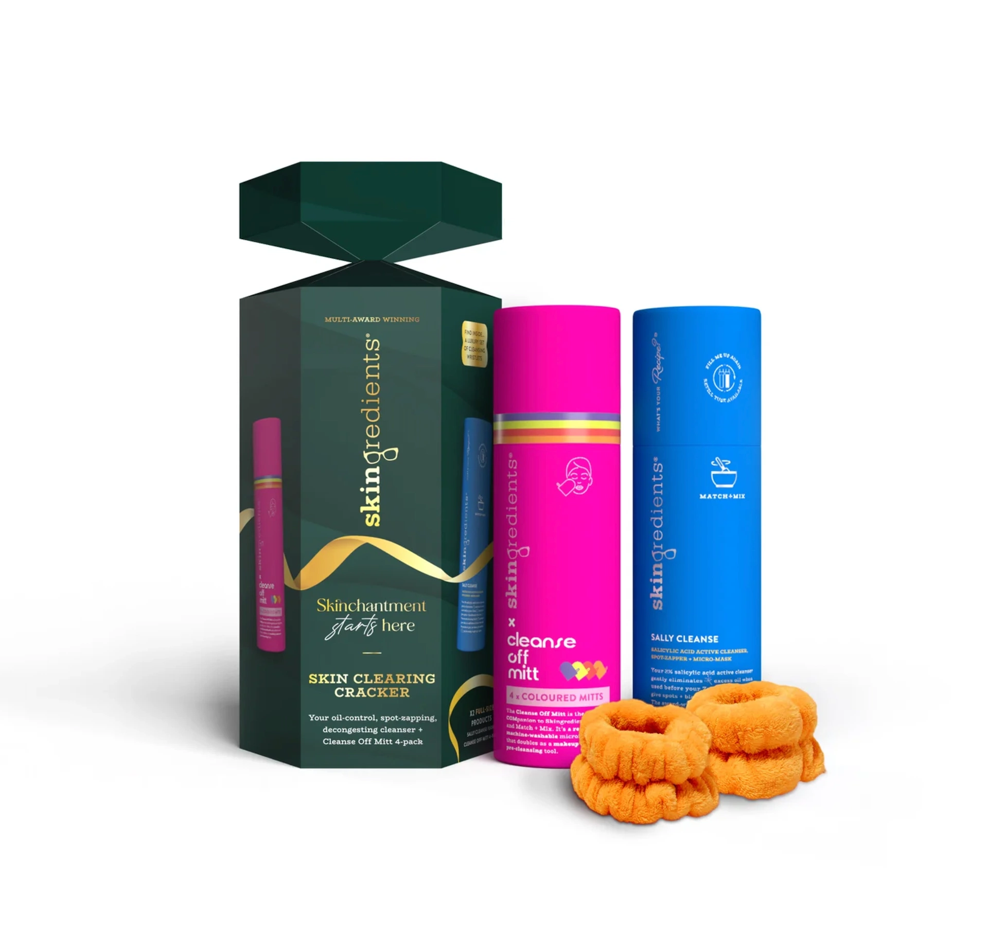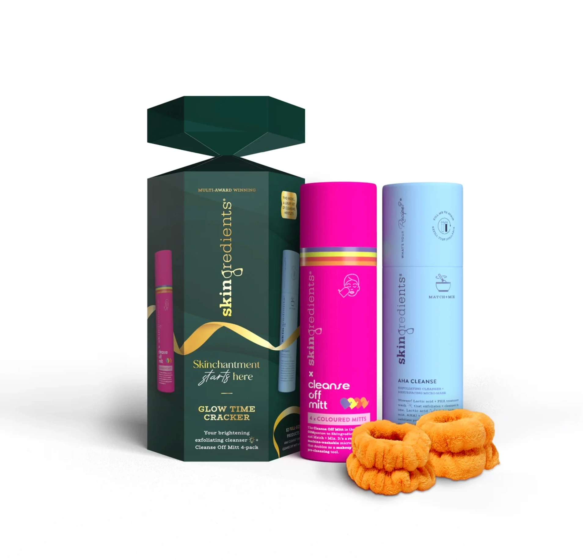 New for 2024, the Skin Glow Cracker is the perfect gift for anyone looking for a healthy glow. Containing a full-size AHA Cleanse Brightening + Exfoliating Lactic Acid Cleanser, a four-pack of Cleanse Off Mitts, and handy cleansing wristlets, it comes in a cute cracker to really put you in a festive mood.