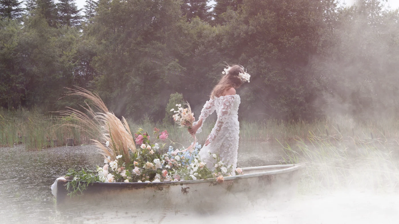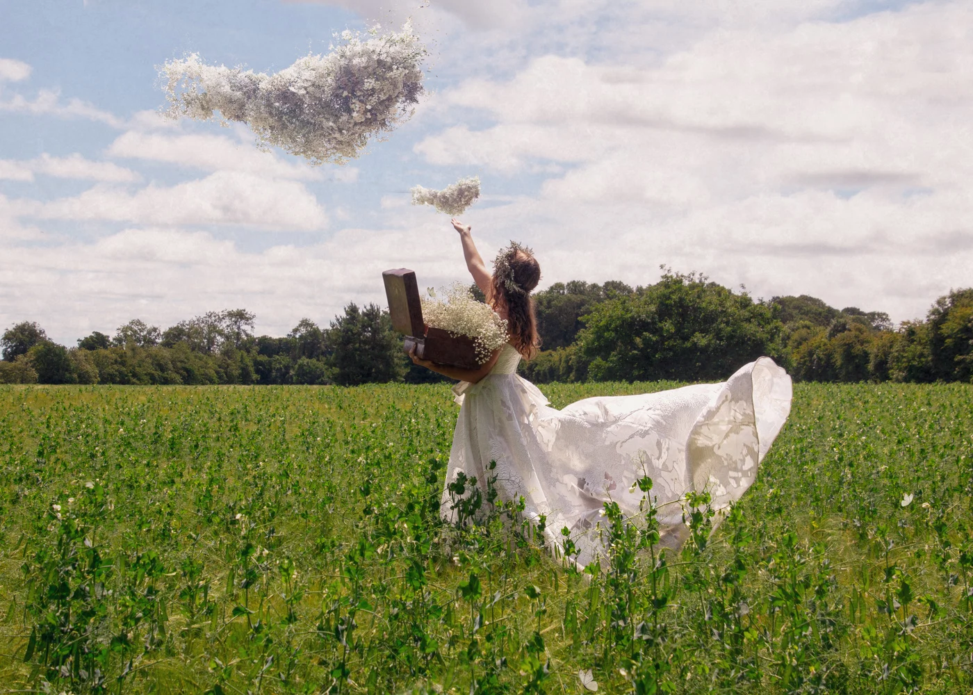 In the morning light, a figure of a woman could be seen building a giant flower cloud of baby’s breath, suspended between two old fir trees.