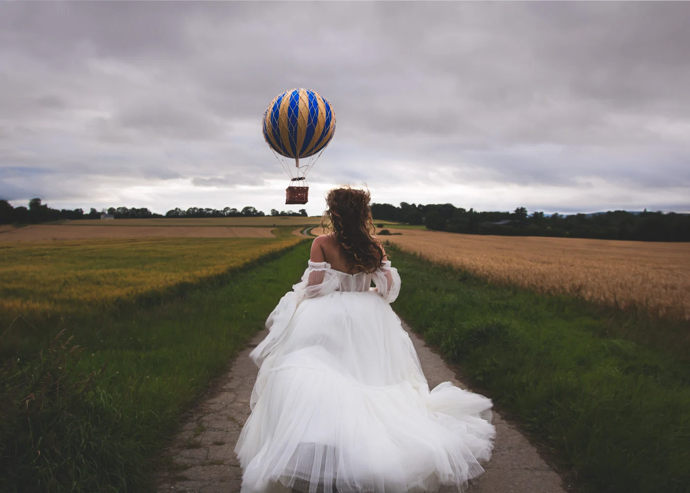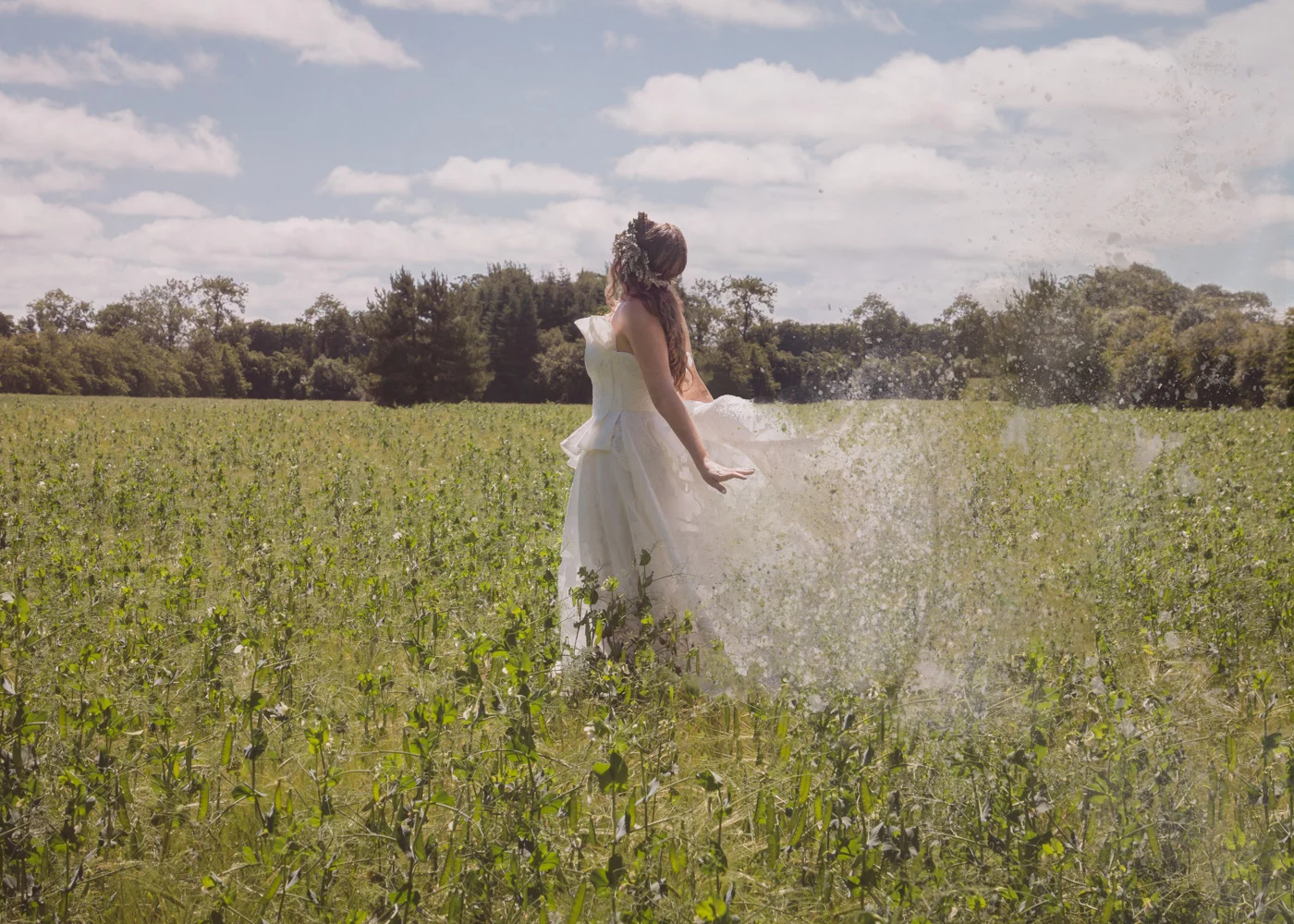 We began our day of serious fun by photographing in a pea field full of butterflies. Here Siobhan managed to elegantly stand on top of a step ladder, throwing imaginary clouds into the air all the while keeping her composure, whilst Michael Browne (our talented make-up artist), burrowed under the silks of her dress. There he remained for the duration of the shoot imitating the best wind machine a photographer could ask for.