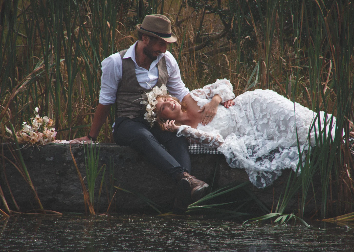 There we all were, Siobhan and Shane in a lovers’ embrace, Jamie holding a reflector (he had agreed to lend his professional experience in film and become my assistant director for the day), my camera perilously close to water and Tina occasionally remarking that this was one of the strangest moments of her life, as she continuously rearranged flower petals in the water around them.