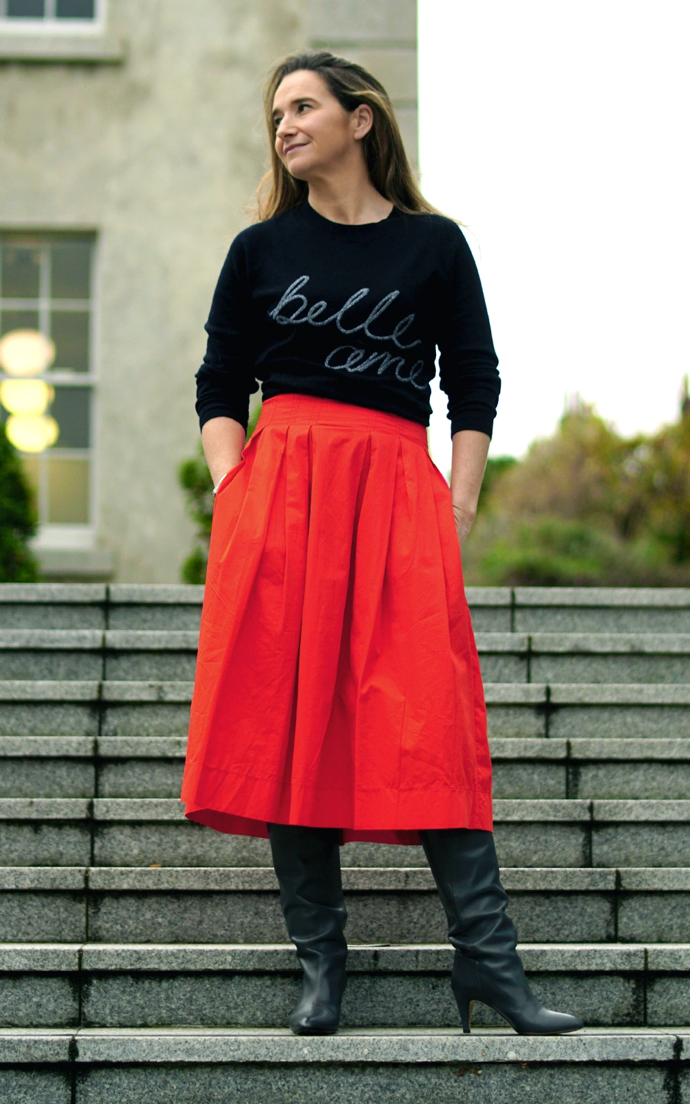 I bought this skirt back in May in Zara. I immediately loved the colour, the thick banded waist and full pleated skirt. It is so easy and comfy to wear and the pockets make it. I wore it to death over the summer, with flat gold sandals and a fitted black cotton t-shirt. I was about to put it away for the winter months but then tried it with knee-high leather boots and a cashmere jumper and now I’ll be wearing it right through ’til May again!