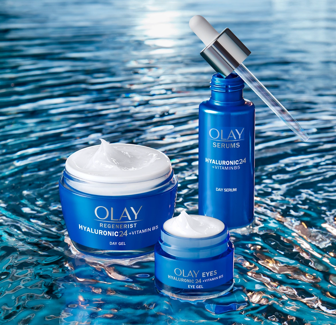 The Olay Hyaluronic24 + Vitamin B5 Day Gel Cream leaves skin instantly hydrated for 24 hours, and is non-greasy and non-comedogenic. The Olay Hyaluronic24 + Vitamin B5 Eye Gel Cream is cooling and refreshing, specifically formulated to hydrate and nourish the delicate eye area. Olay’s Hyaluronic24 + Vitamin B5 Day Serum leaves skin instantly hydrated for 24 hours, and boosts your skin’s moisture barrier in a single application.
