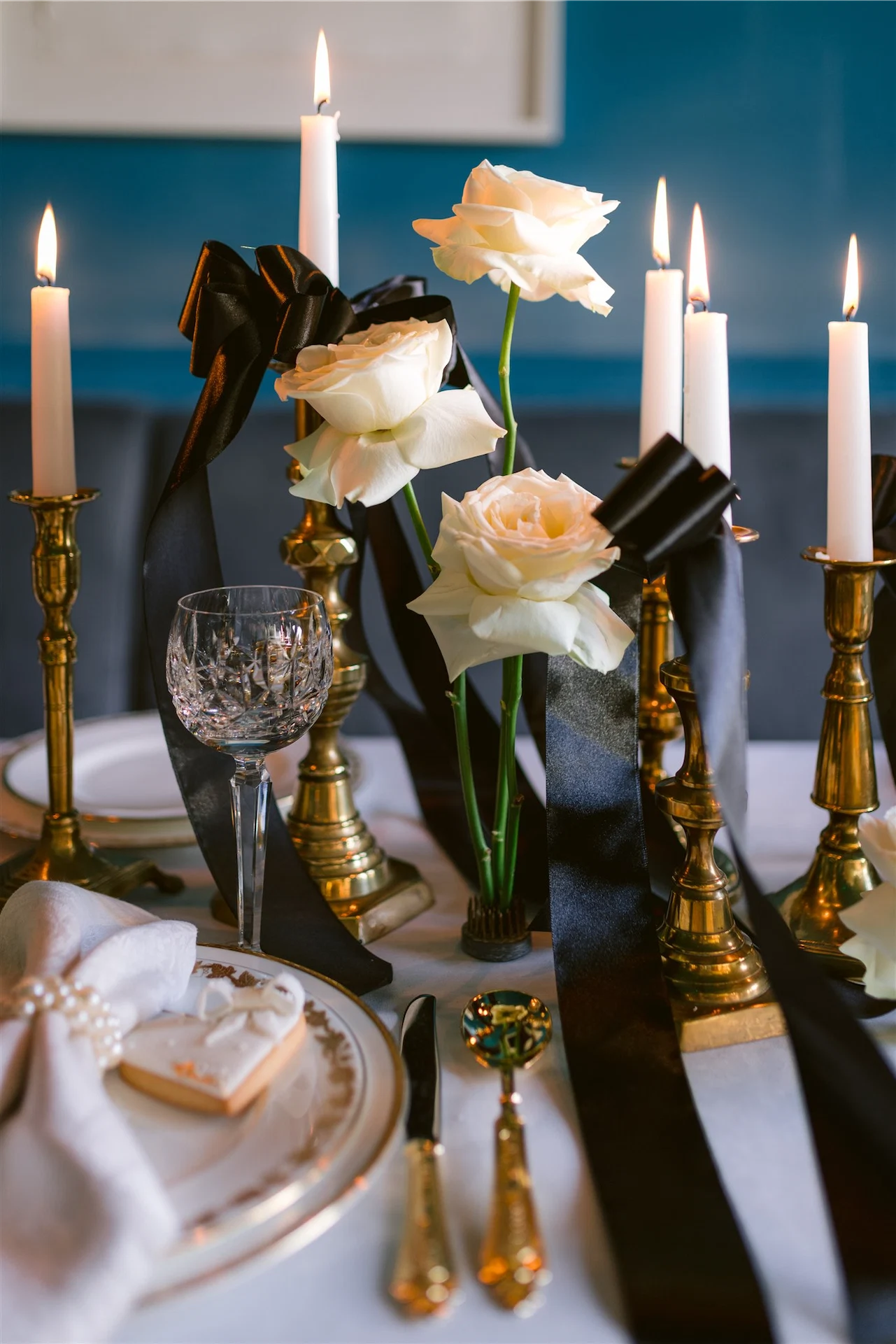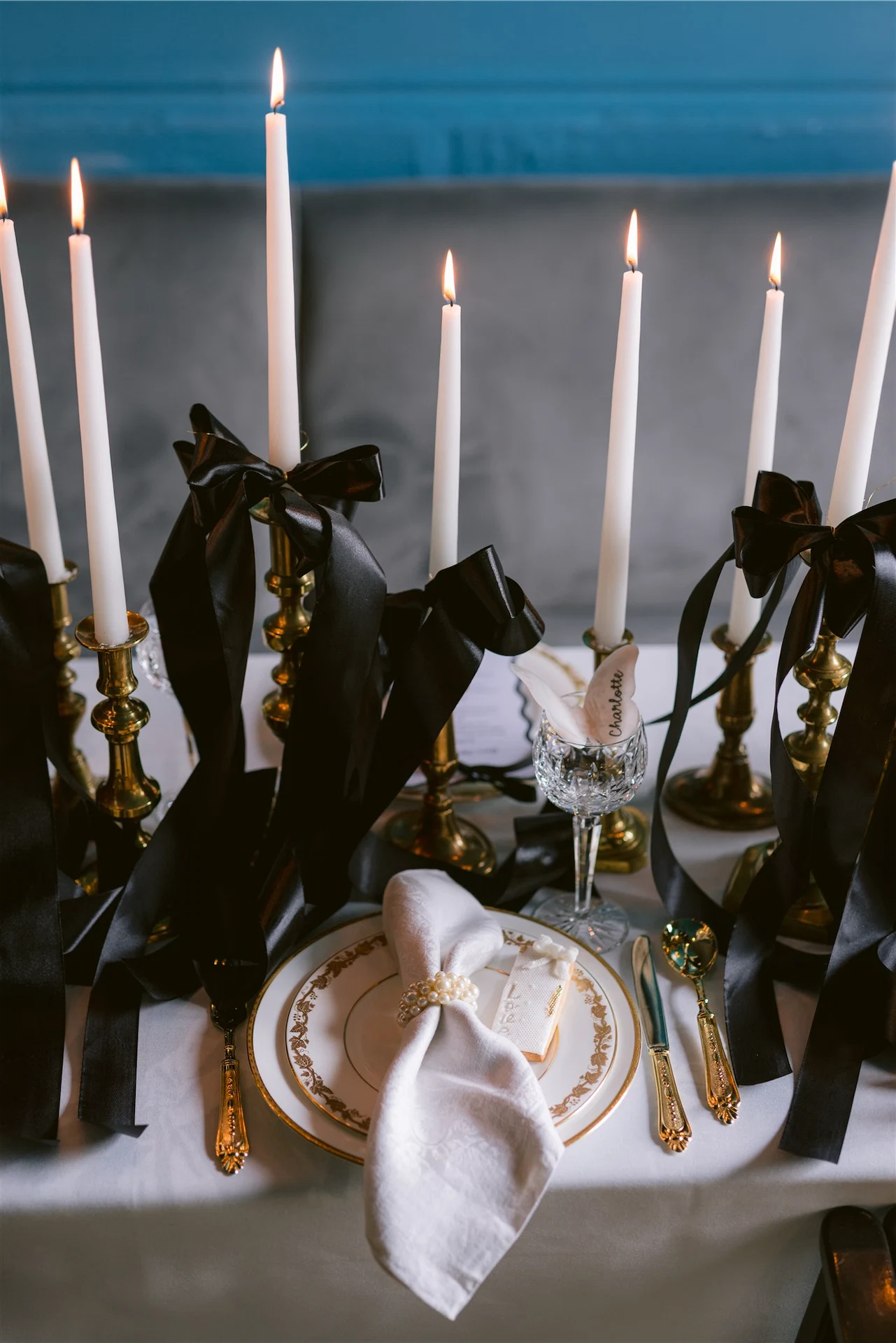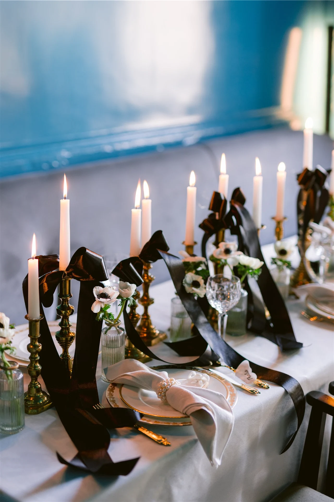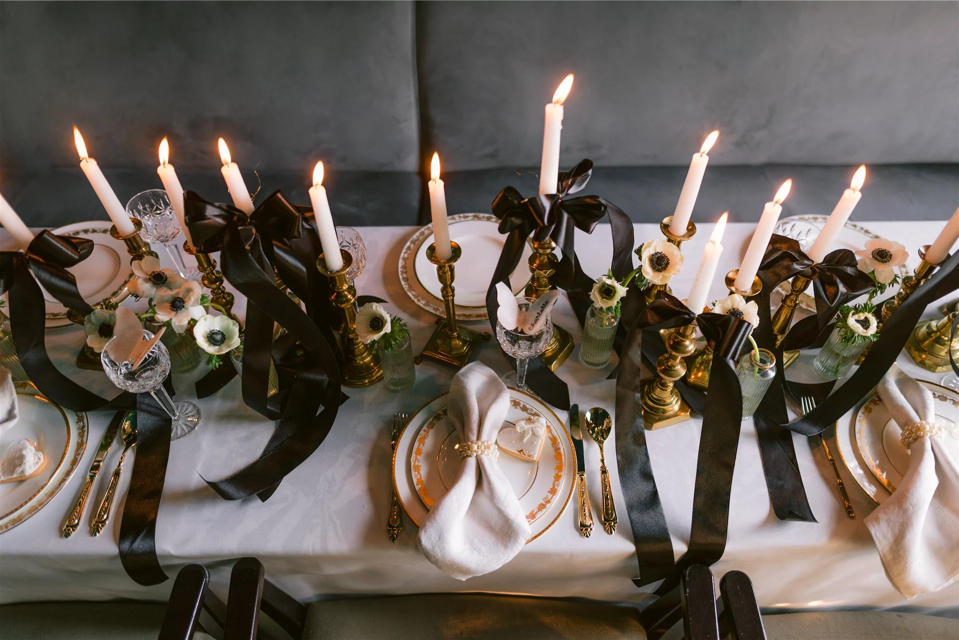 The versatility of the theme is showcased through the tasteful details, alongside three distinct table settings, each offering its own interpretation. From the abundance of candles with cascading ribbons in the first setting, to romantic anemones in the second and classic roses in the third, every detail is thoughtfully curated to blend modernity with vintage seamlessly.