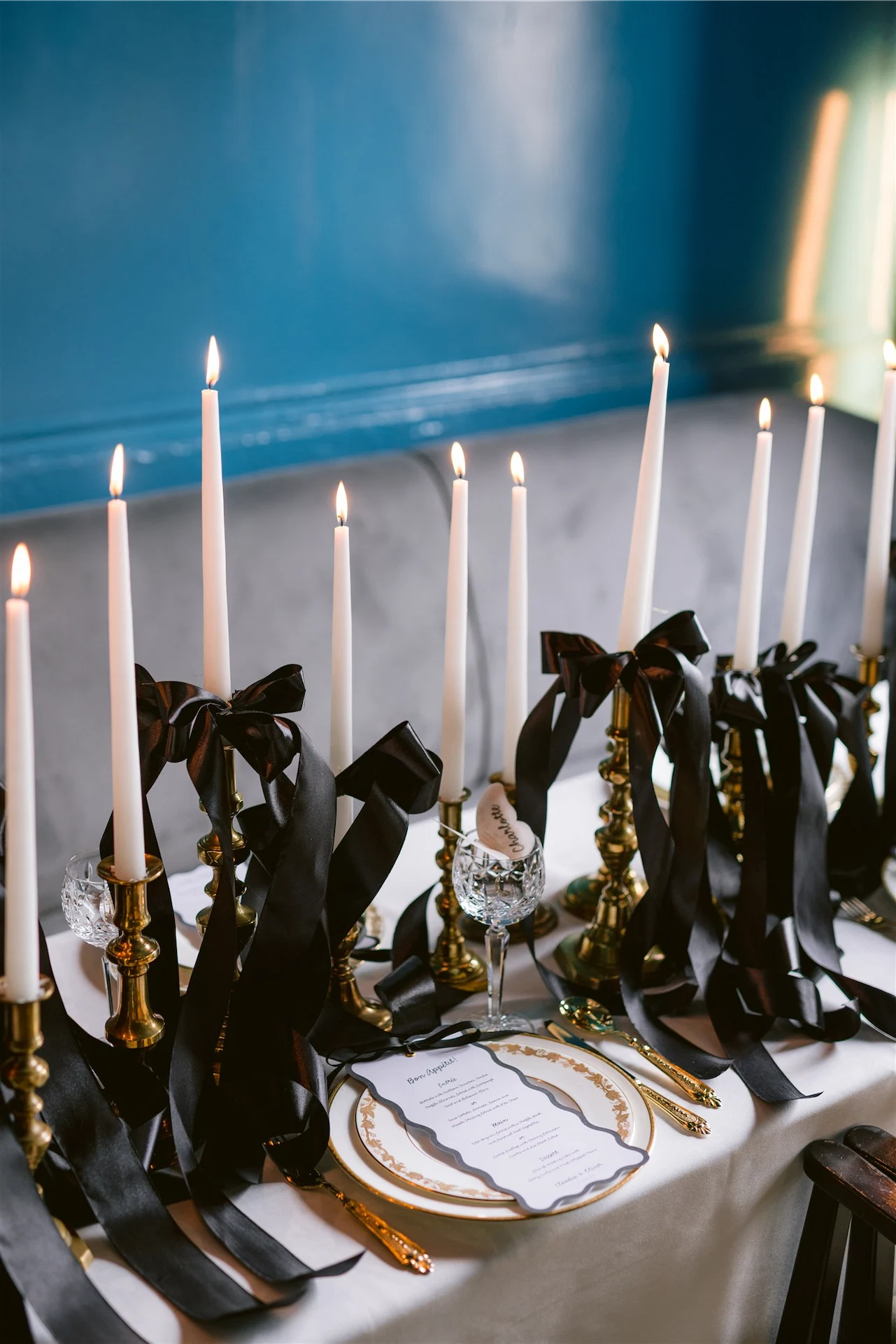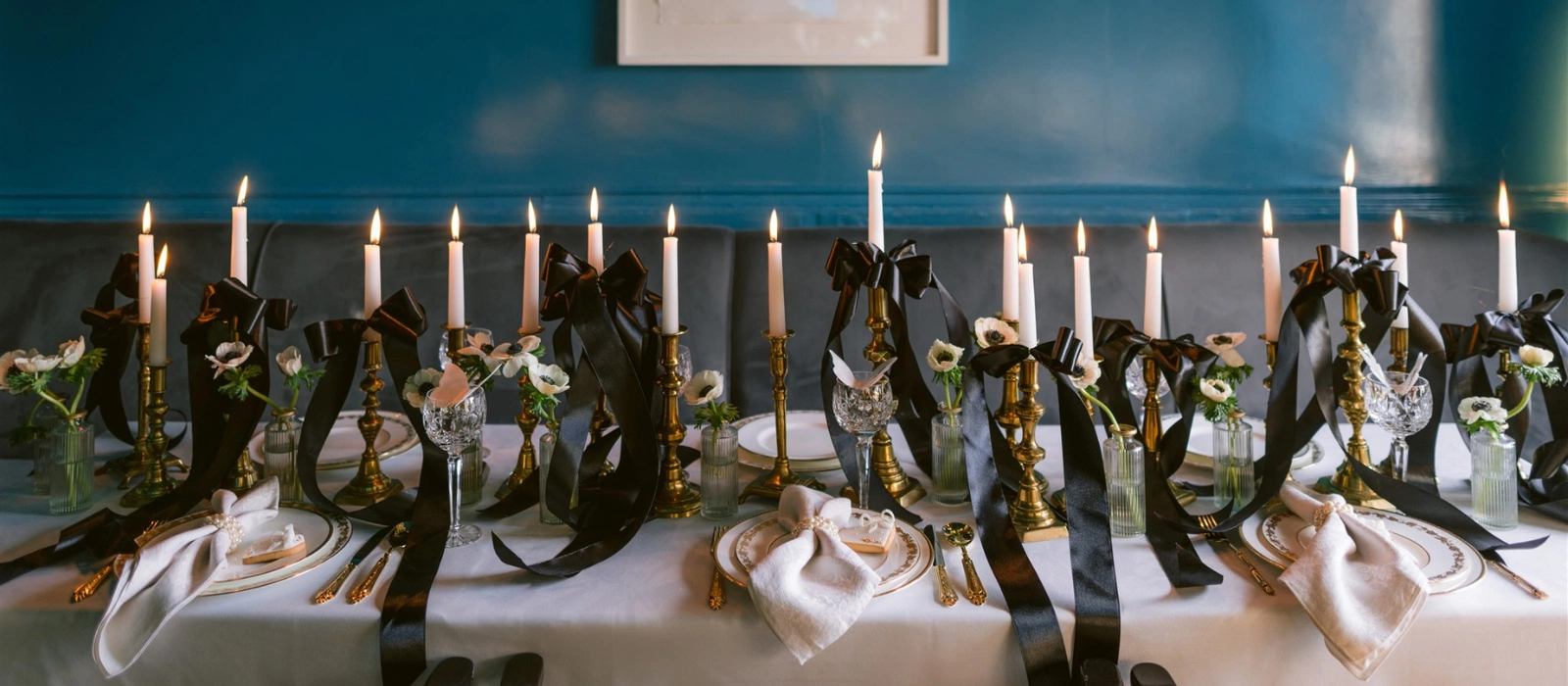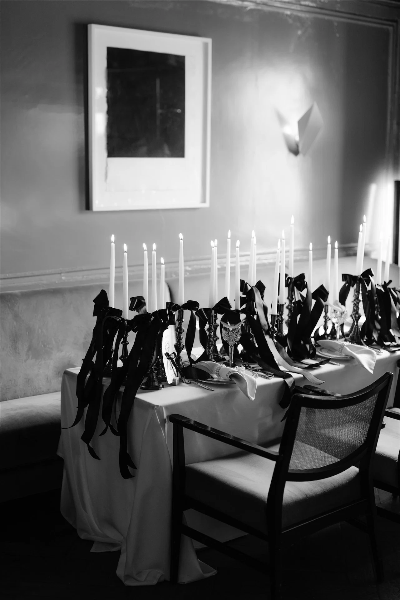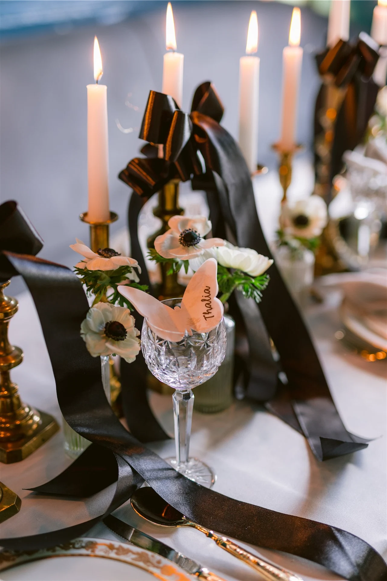 The versatility of the theme is showcased through the tasteful details, alongside three distinct table settings, each offering its own interpretation. From the abundance of candles with cascading ribbons in the first setting, to romantic anemones in the second and classic roses in the third, every detail is thoughtfully curated to blend modernity with vintage seamlessly.