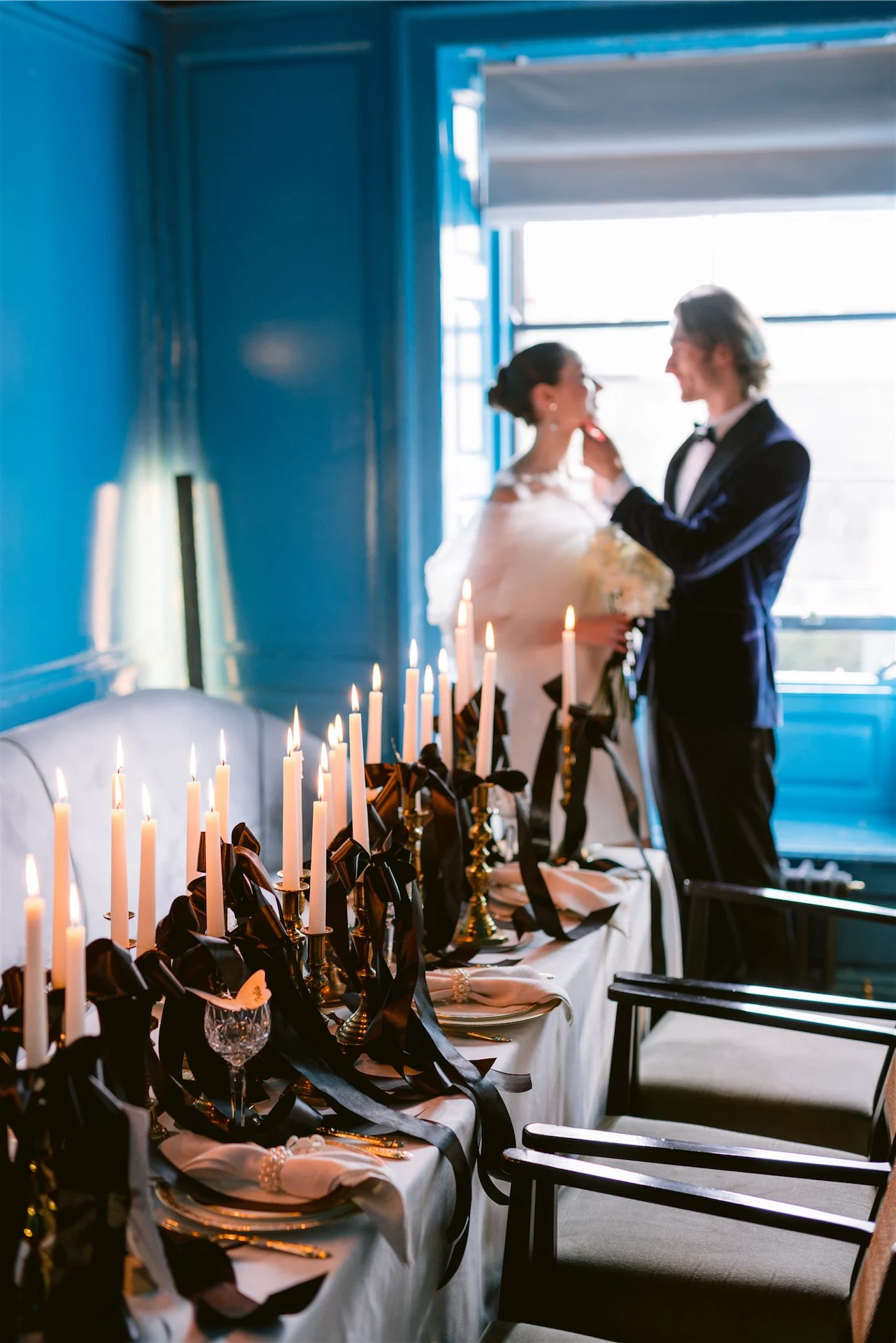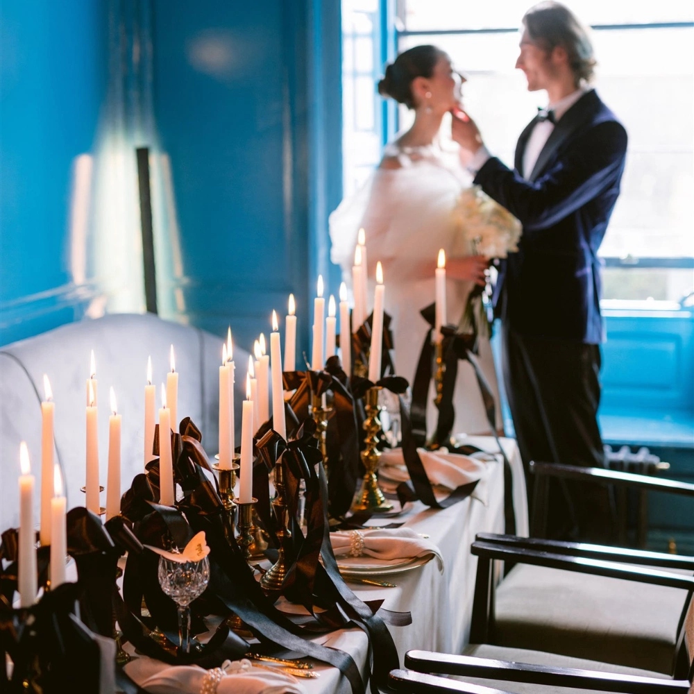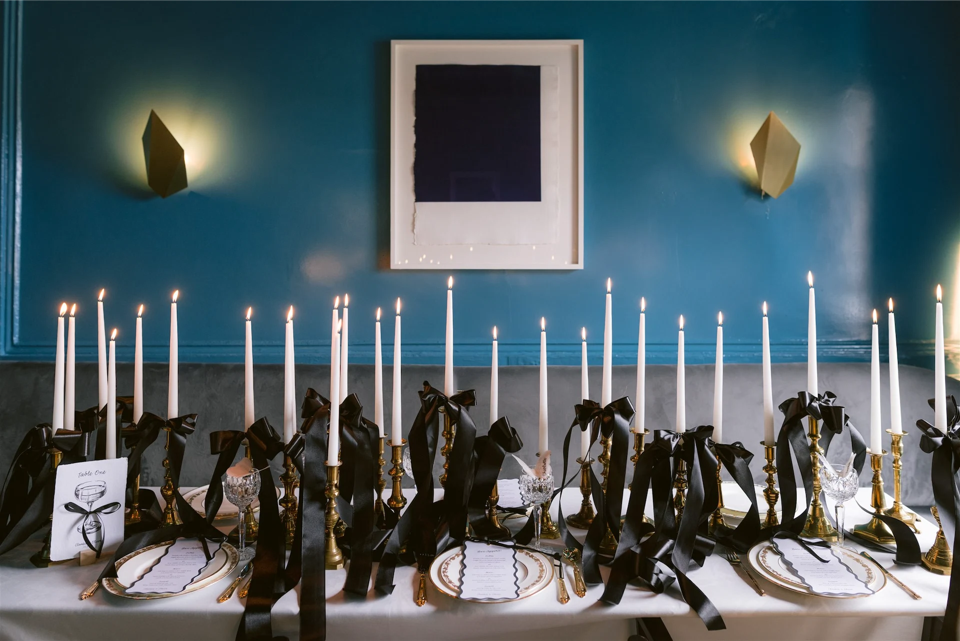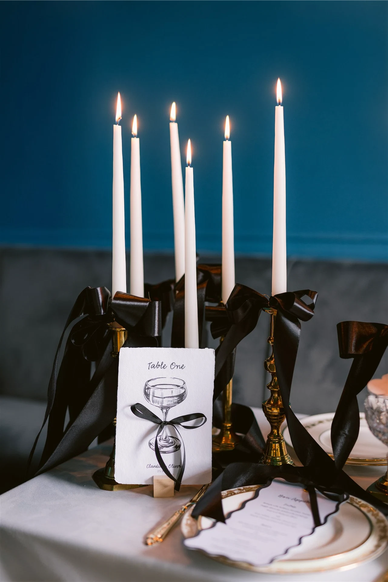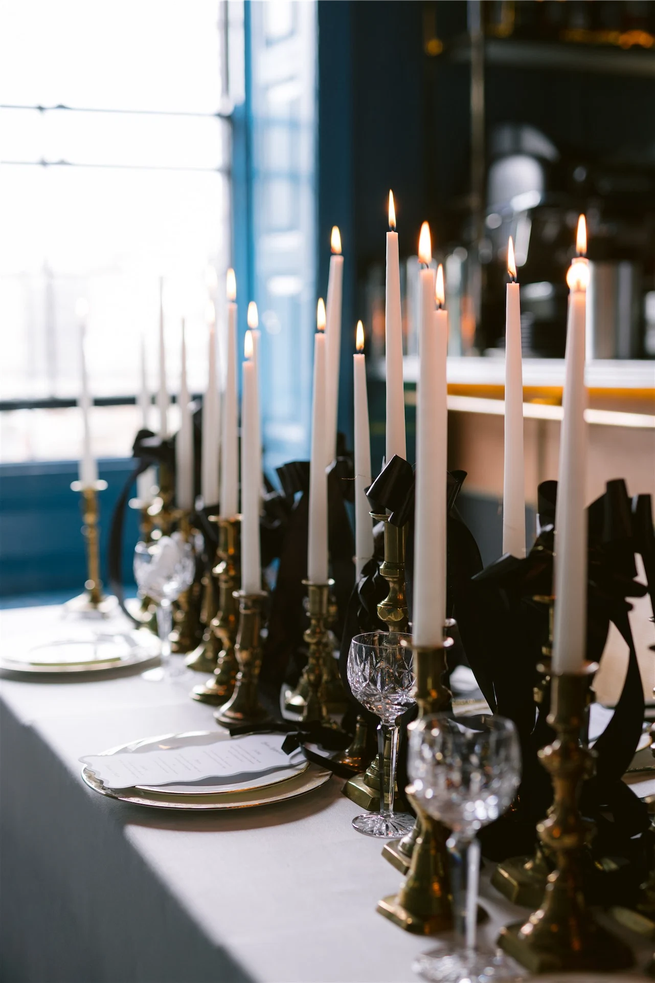 The versatility of the theme is showcased through the tasteful details, alongside three distinct table settings, each offering its own interpretation. From the abundance of candles with cascading ribbons in the first setting, to romantic anemones in the second and classic roses in the third, every detail is thoughtfully curated to blend modernity with vintage seamlessly.